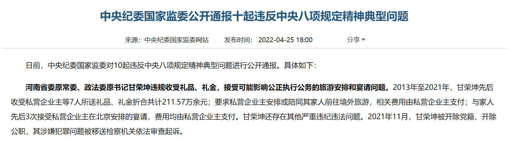 中央纪委国家监委网站 陆丽环报道 4月25日,中央纪委国家监委公开通报10起违反中央八项规定精神典型问题。严肃查处并公开通报这些典型案例,彰显了党中央从严管党治党的坚强决心,体现了拒腐防变从领导干部抓起、从作风严起的鲜明导向。 每到节假日前夕,中央纪委国家监委公开通报典型案例,已成为惯例。相比以往公布的典型案例,今年“五一”节前通报的典型案例特点更为突出。 从违纪内容看,违规接受宴请和旅游安排、收受礼品礼金、出入私人会所、违规使用公车等,成为节日期间易发多发的“通病”。比如,2013年至2021年,河南省委原常委、政法委原书记甘荣坤先后收受私营企业主等7人所送礼品、礼金折合共计211.57万余元;要求私营企业主安排或陪同其家人前往境外旅游,相关费用由私营企业主支付;与家人先后3次接受私营企业主在北京安排的宴请,费用均由私营企业主支付。全国查处违反中央八项规定精神问题月报数据也体现出这些问题高发的特点。数据显示,今年前三个月,全国共查处享乐主义、奢靡之风问题10696起,其中,违规收送名贵特产和礼品礼金、违规吃喝2类问题占查处享乐主义、奢靡之风问题总数的57.5%。 从通报对象看,10起案例中,5人为中管干部,5人为厅局级干部,涉及中央和国家机关、地方党政机关、国有金融企业等单位,其中4人是所在单位或部门“一把手”。这表明党中央持续巩固中央八项规定堤坝的鲜明态度,中央八项规定就是带电的“高压线”,不管是谁,不管地位多高,只要违反中央八项规定精神,就要受到严肃处理。 从违纪时间看,被通报人员在党的十八大乃至十九大之后仍然不收敛不收手,反映出“四风”问题树倒根存、顽固复杂的特点。比如,2014年至2021年,河北省人大常委会原党组成员、副主任宋太平多次接受私营企业主在公司内部食堂、私人会所安排的宴请,并饮用高档酒水。对党的十九大以来仍然不知敬畏、胆大妄为的,坚决严查严办,公开通报曝光,持续释放越往后执纪越严、真管真严、敢管敢严、长管长严的强烈信号,给党员干部敲响警钟。 今年是中央八项规定出台的第十个年头。10年来,各地驰而不息纠治“四风”、推进作风建设,党风政风不断好转。但仍有少数党员干部心存侥幸,把落实中央八项规定精神当作“耳旁风”,视纪律为“稻草人”,明目张胆、顶风违纪,频频踩“红线”、闯“雷区”,由风及腐、由风变腐、风腐一体问题明显。 小节失守,大节难保。纵观大量案例,从一顿饭、一瓶酒、一份礼品这些小事小节中走上违法犯罪道路的党员干部不在少数。通报案例中,“高档烟”“高档酒水”“高档菜肴”等词反复出现。比如,2014年至2020年,江西省政协原党组成员、副主席肖毅多次收受私营企业主所送礼品、礼金折合共计84.9万元;多次接受私营企业主安排的宴请,食用高档菜肴,饮用高档酒水。 “围猎”也是不正之风顽固反复的原因之一。记者发现,通报案例中多次出现“接受私营企业主安排”“收受私营企业主礼品、礼金”等表述。少数领导干部在“围猎”者投其所好的攻势下,逐渐放松了对自己的要求,把初心抛到脑后,把权力当做谋利工具,一步步沦为腐败分子。 节点就是考点,过节必先过关。一些党员干部之所以过不了“廉关”,往往就是理想信念的“第一粒扣子”没有系好。 “为什么我这么努力却过得清苦?”“凭什么老板们赚钱那么容易?”这两个问题曾经成了甘肃省工业和信息化厅原党组成员、副厅长李生发的心魔。在欲望的支配下,李生发频频踩“红线”、闯“雷区”,在党的十八大甚至十九大后仍不收敛,多次接受私营企业主的宴请、旅游安排,非山珍海味不吃,非限量版高档酒不喝,饭后定要前往夜总会唱歌娱乐,并接受有偿陪酒服务,在违法乱纪的泥潭里愈陷愈深。 在诱惑面前定不住神、立不住脚,贪欲的闸门一旦打开,很容易愈陷愈深。“逢年过节就是意思一下”“咱俩这关系还客气什么”,这些惯常话语套路下,加上礼节性的“包装”,又与“感情投资”相结合,日积月累,领导干部在不知不觉中放松警惕、破纪破法。在“围猎”者心中,“礼”在当下,“利”在日后,打着“人情”“礼尚往来”的幌子送烟送酒、安排旅游,采取“温水煮青蛙”式的“感情投资”,让党员干部放松警惕,一步步滑入权钱交易的腐败泥潭。 能不能过好亲情关,特别是在节假日期间过好家属子女关,对每个党员干部来说都是很现实的考验。一些党员领导干部自感经常忙于工作,对家人疏于照顾。出于“亏欠心理”,在家属子女提出无理要求时,不仅没有及时阻止,反而放任他们打着自己的旗号谋取私利。“这1000多万元,我真正直接用的不到100万元,其他都是给亲人,涉及6个亲人。”四川省交通投资集团有限责任公司原党委书记、董事长雷洪金交代说。 面对“围猎”、面对诱惑、面对亲情,每一名党员干部都要坚持从小事小节上加强修养,从一点一滴中砥砺品格、严守规矩、不逾底线,补足精神之钙,永葆共产党人拒腐蚀、永不沾的政治本色。