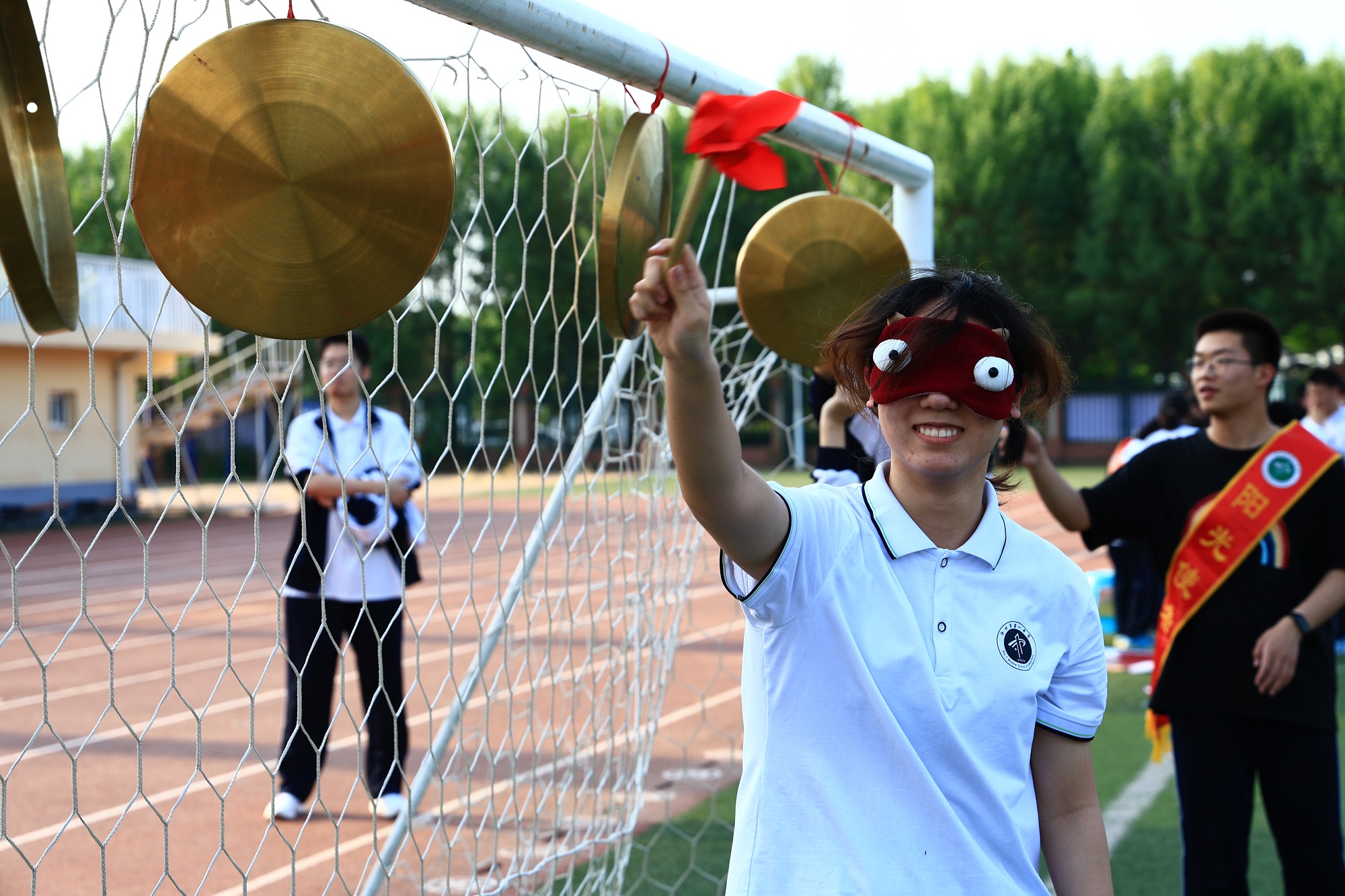 大象鼻子转完三圈后,同学凭借出色的平衡感和良好的方向感,带着眼罩摸索前进。“在你左边!”“再走两步!”“在前边,在前边!”“右右右右!”“这有人,不是锣!”挑战者在同学们七嘴八舌的指引中努力找到自己的方向。振臂一挥,“铛~”锣声洪亮,是信任与坚持最好的结果。