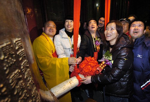 2008年1月1日零时零分,悠扬的钟声回荡在金陵古刹毗卢寺,羽坛伉俪葛菲、孙俊,剑坛女杰肖爱华等世界冠军与南京市民一起撞钟,用钟声祝福北京奥运会。新华社记者孙参摄