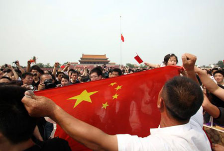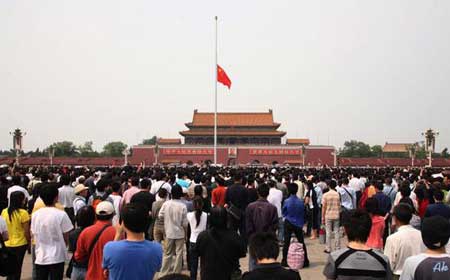 • 天安门众多群众默哀 齐声高呼“加油中国”2008-05-19 20:18