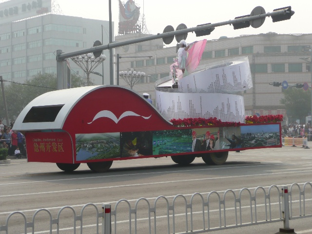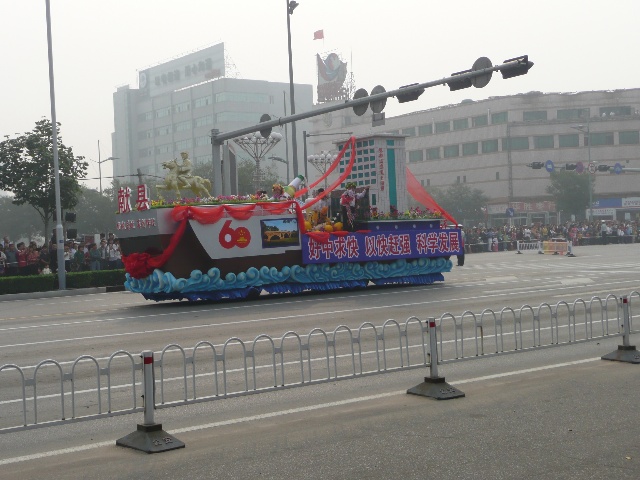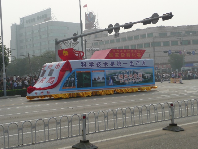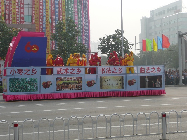 沧州为庆祝建国60周年,举办了一系列的活动。最吸引眼球的活动,就是大型花车巡游。今天上午,我市举行了盛大的“迎国庆 颂沧州”彩车展演活动,掀起了我市庆祝活动的高潮,展现了沧州在60年里所发生的变化。风格各异的34辆大型花车,18辆鼓乐车以及18个轿车方队在沧州市市区进行巡游。这也是沧州市规模最大的一次花车巡游活动。