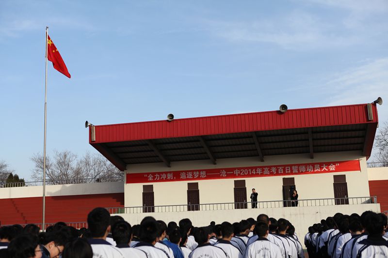 2月27日下午4时,在离2014年高考仅有百天的时间里,沧州市第一中学全体高三师生在学校操场举行了隆重的百日宣誓大会,以此激励师生克难奋进,求真务实,迎战高考。 学生代表在发言中表示,高三的生活既有压力,也充满动力,在以后的学习中,将树立自己的信心和斗志,制定科学的复习策略,全身心地投入到高考备考中,为实现自己的大学理想不断努力。同时表示了自己的决心,在最后的100天中,坚持拼搏,高效利用,师生团结朝着共同的梦想前行。教师代表律荣庆老师代表全体老师在学生面前宣誓:将为学生的成才奉献出自己的全部力量。学校年级主任刘德红就高三后阶段的复习思路和方法提出了指导性意见。并对成绩优秀的学生以及成绩进步学生给予了表彰和奖励。通过百日宣誓仪式,既激发了同学们的学习斗志,又提高了学生的心理素质。