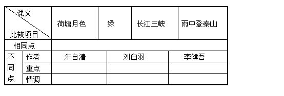 如高中第一册散文单元的四篇文章,通过预习,可以发现它们有不少相同点和不同点。如果把它们用表格的形式列出来,对我们上课听讲、下课复习,大有好处。请看下表:
