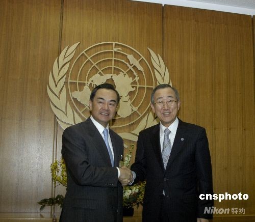 | 4月17日, 正在纽约出席安理会非洲问题高级别会议的中国国家主席特别代表、外交部副部长王毅会见了联合国秘书长潘基文。 中新社发 谭宏伟 摄 |