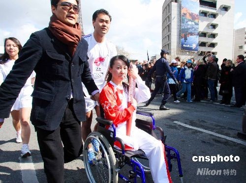 这是4月7日拍摄的奥运火炬手金晶在北京奥运会火炬接力巴黎站的传递活动中奋力保护火炬。金晶,这位被网友们称为“轮椅上的微笑天使”、“最美丽的火炬手”的27岁女孩,是来自上海的残疾人击剑运动员。北京时间4月7号下午6点30分,奥运圣火在巴黎传递,少数藏独分子企图抢夺火炬破坏传递活动,竟然把黑手伸向了坐在轮椅上的火炬手金晶。面对突如其来的冲击,柔弱的金晶紧紧抱着火炬,凶狠的暴徒拉扯着她的胳膊,她扭过身让出后背,用整个身体来保护火炬,最终暴徒被警察制服并带走。
