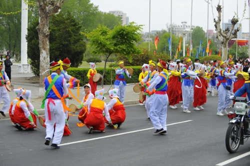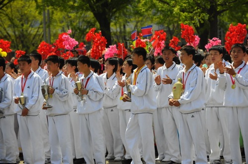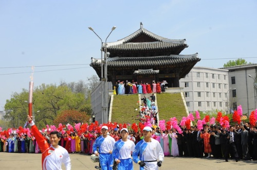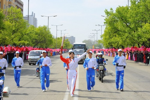 以劳动模范为主体组成的火炬手奔跑在平壤的大街上