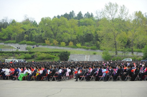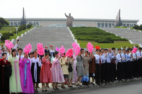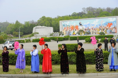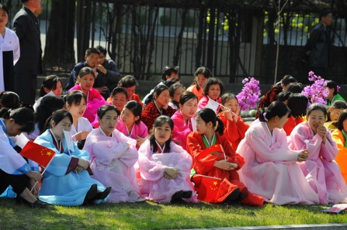 起跑仪式前,着节日盛装的平壤民众在草坪上等待