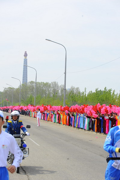 我不知道该怎样用语言来形容这个据说由百万人参与的传递(具体的数字谁也说不清)。传递之前,朝鲜的官员曾说过,平壤的传递会让世界震惊。对于那些熟悉朝鲜的人来说,今天我们看到的朝鲜式的欢迎,他们从来都不陌生,也不会感到震惊,因为这样的庆典在平壤是常见的。
