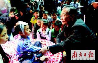 下着雨,这个66岁的老人,头发、肩膀都是湿的。他来到受灾群众中,看到一个孩子张着嘴巴哭。他摸着孩子的脸蛋说:“不哭了,是不是肚子饿了?马上就会给你送吃的了!”