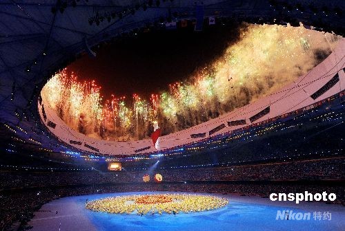 | 8月24日晚,北京奥运闭幕典礼在国家体育场“鸟巢”举行,会场上空施放绚丽的烟火,拉开典礼序幕。 |