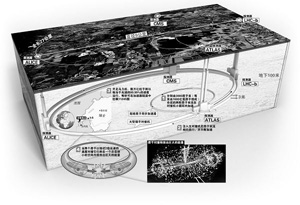 这台对撞机是世界最大的粒子加速器,建于瑞士和法国边境地区地下100米深处的环形隧道中。