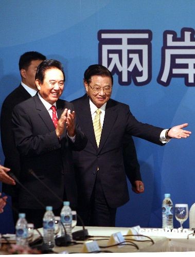 十一月五日上午,两岸工商及航运座谈会在台北圆山饭店举行。图为海协会会长陈云林、海基会董事长江丙坤一同出席座谈会。 中新社发洪少葵摄