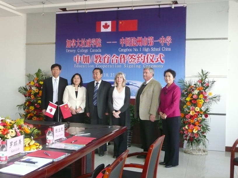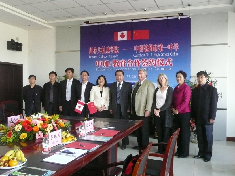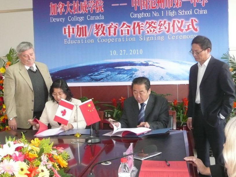 杜威学院是在加拿大安大略省教育部注册认可,并获得学分授予权的全日制高中和大学预科学院。学院既招收当地学生,又招收国际学生,是一所教学质量很高的的开放式高中。我校有着优秀的办学传统、严谨的治学风格和优良的学习风气。我相信,在两个文化世界里的高端中学的联手下,在中西文化的合力下,将有越来越多的沧州学子从这里走入自己向往的大学、名校。这不仅是我们每一个一中人的热望,也是每一个沧州人的热望。