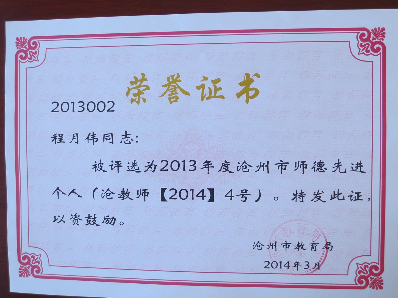 根据《沧州市教育局关于对全市中小学校师德建设工作进行考核的通知》,我校程月伟被评选为2013年度沧州市师德先进个人。(常树青 李智 尹晶)