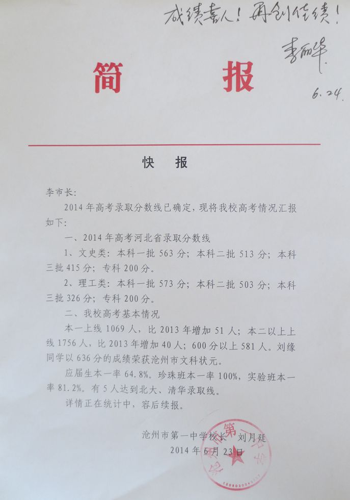 一中高考成绩的取得,饱含了沧州一中全体教职员工在过去的一年中的辛勤劳动和不懈努力。在今后的工作中,希望广大教职工要继承发扬永不服输的进取精神,牢固树立敢为人先的创新意识,扎实做好高效课堂建设的各项工作,稳步推进,再接再厉,争取2015年高考取得更好的成绩。