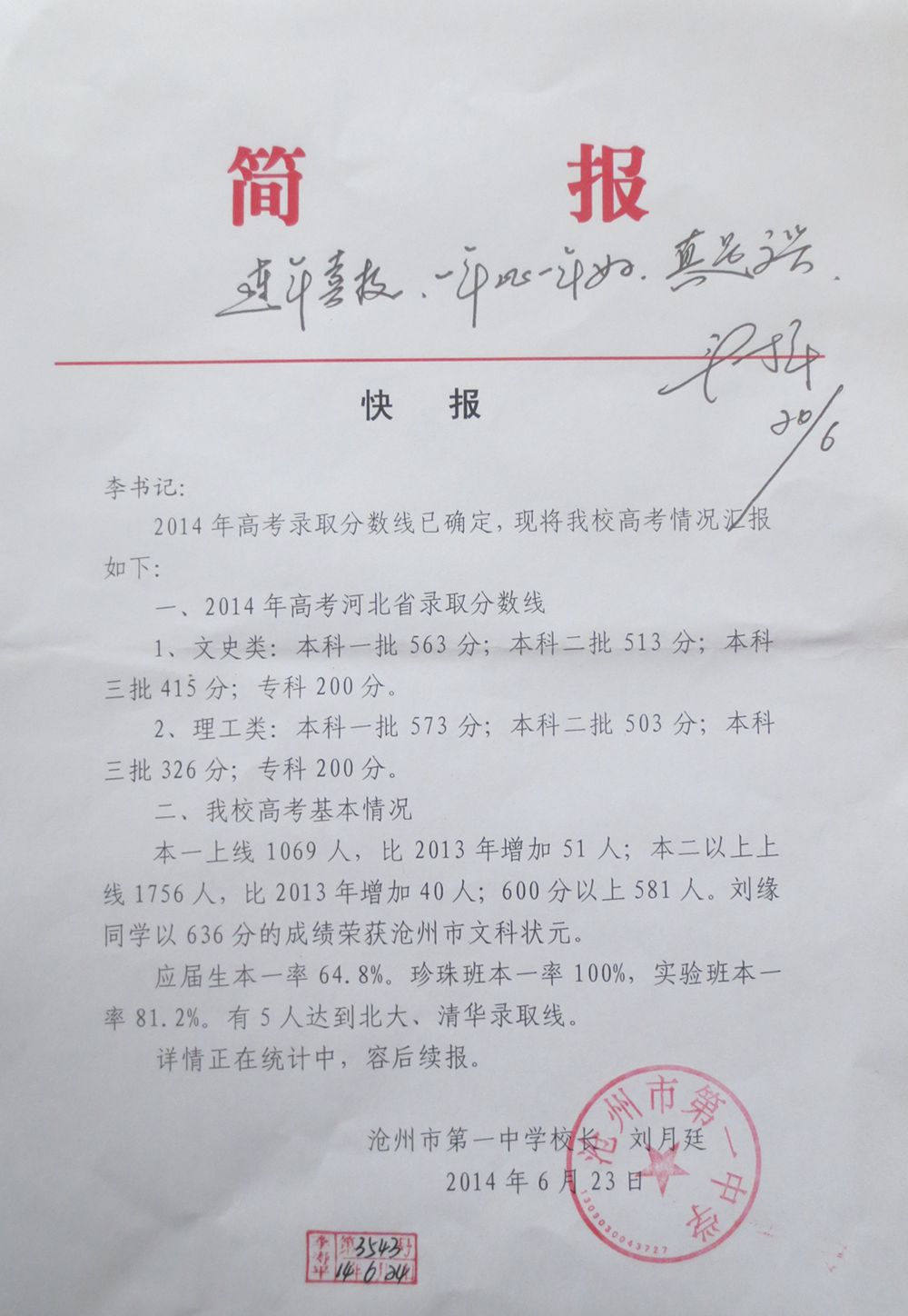 2014年高考,我校取得了优异成绩,纪检书记李寿平同志在我校呈报的《高考快报》中作出重要批示:“连年喜报,一年比一年好,真是高兴!”