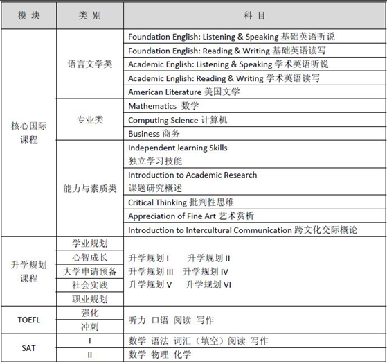 PGA国际课程由中际育才负责完成,外教授课并配备中方辅导老师指导学生学习。PGA国际课程由若干课程模块组成,高中三年总共约1800课时。核心国际课程包括基础英语、学术英语、数学、商务、计算机、独立学习技能等课程。