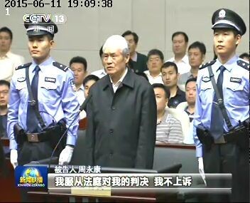 新华社天津6月11日电 2015年6月11日,天津市第一中级人民法院依法对周永康受贿、滥用职权、故意泄露国家秘密案进行了一审宣判,认定周永康犯受贿罪,判处无期徒刑,剥夺政治权利终身,并处没收个人财产;犯滥用职权罪,判处有期徒刑七年;犯故意泄露国家秘密罪,判处有期徒刑四年,三罪并罚,决定执行无期徒刑,剥夺政治权利终身,并处没收个人财产。周永康当庭表示,服从法庭判决,不上诉;进入司法调查以来,办案机关依法办案、文明执法,讲事实、讲道理,充分体现了我国司法的进步,使他认识到自己违法犯罪的事实给党的事业造成的损失,给社会造成了严重影响,再次表示认罪悔罪。