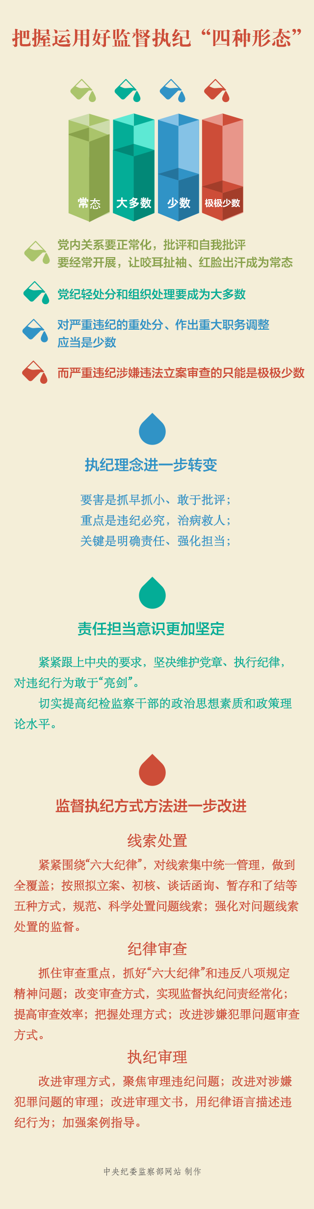 王岐山同志从推进全面从严治党的战略高度,强调要把纪律和规矩挺在前面,把握运用监督执纪“四种形态”:党内关系要正常化,批评和自我批评要经常开展,让咬耳扯袖、红脸出汗成为常态;党纪轻处分和组织处理要成为大多数;对严重违纪的重处分、作出重大职务调整应当是少数;而严重违纪涉嫌违法立案审查的只能是极极少数。
