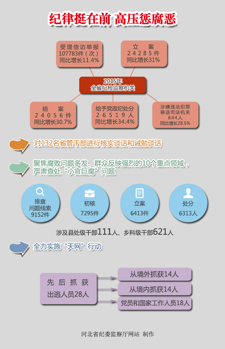 编者按]2015年,在党中央、中央纪委的坚强领导下,省委和全省各级党组织深入学习贯彻习近平总书记系列重要讲话和对河北的重要指示精神,坚决与党中央保持高度一致,坚决贯彻全面从严治党要求,坚决纠正和肃清周本顺带来的不良影响,坚定不移推进党风廉政建设和反腐败斗争。省纪委和各级纪检监察机关坚持把纪律和规矩挺在前面,聚焦监督执纪问责,持续深化“三转”,踩着不变的步伐,把握节奏和力度,在严惩极少数的同时,更加注重管住大多数;在快查快结的同时,更加注重依纪依规;在强化震慑的同时,更加注重“不敢、不能、不想”的协调推进,扭转了“执纪失之于宽、失之于软”局面,全省党风政风持续好转,腐败蔓延势头进一步得到遏制,由胶着状态向反腐败斗争正在取得压倒性态势转变。本网从今天起推出系列报道“迎接省纪委八届六次全会特稿”,敬请关注。