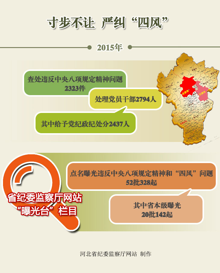 对‘四风’问题露头就打,对顶风违纪行为快查快处,点名道姓公开曝光,不断强化越往后执纪越严的强烈信号。如今,点名道姓、公开曝光已经成为我省纠正“四风”工作的“标配”。2015年,省纪委监察厅网站“曝光台”栏目点名曝光违反中央八项规定精神和“四风”问题52批328起,其中省本级曝光20批142起,起到了有力的震慑警示作用。