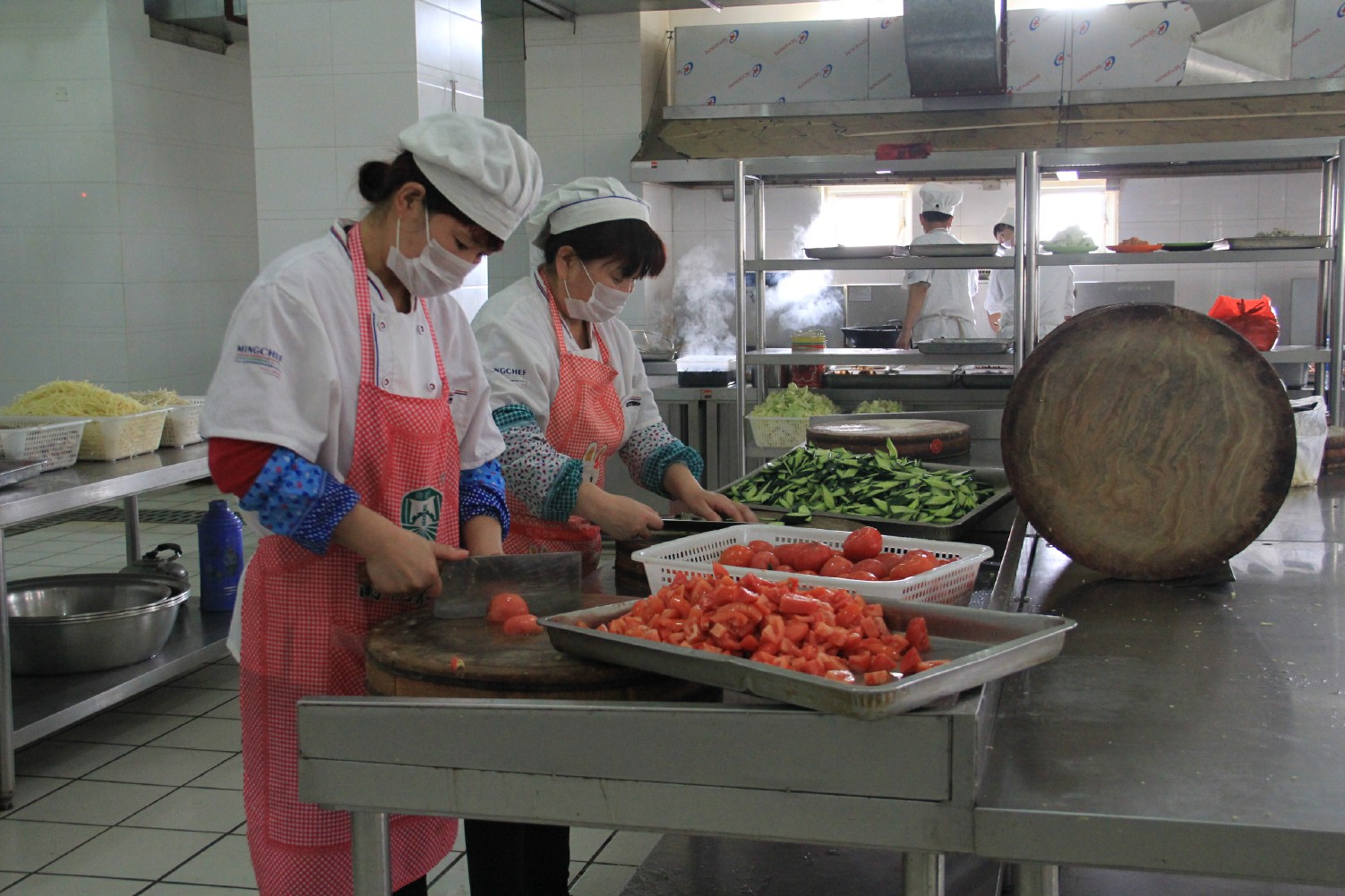 上午九点半,食品药品监督局的工作人员和参观团队来到我校,参观学生餐厅。大家一起走进后厨,按照餐品制作流程,依次参观了菜库、清洗间、操作间和烹饪间。参观途中大家更是细心地与餐厅工作人员交谈,从蔬菜的购进、择菜、清洗、制作到烹饪,全程无死角地了解餐品的制作流程。