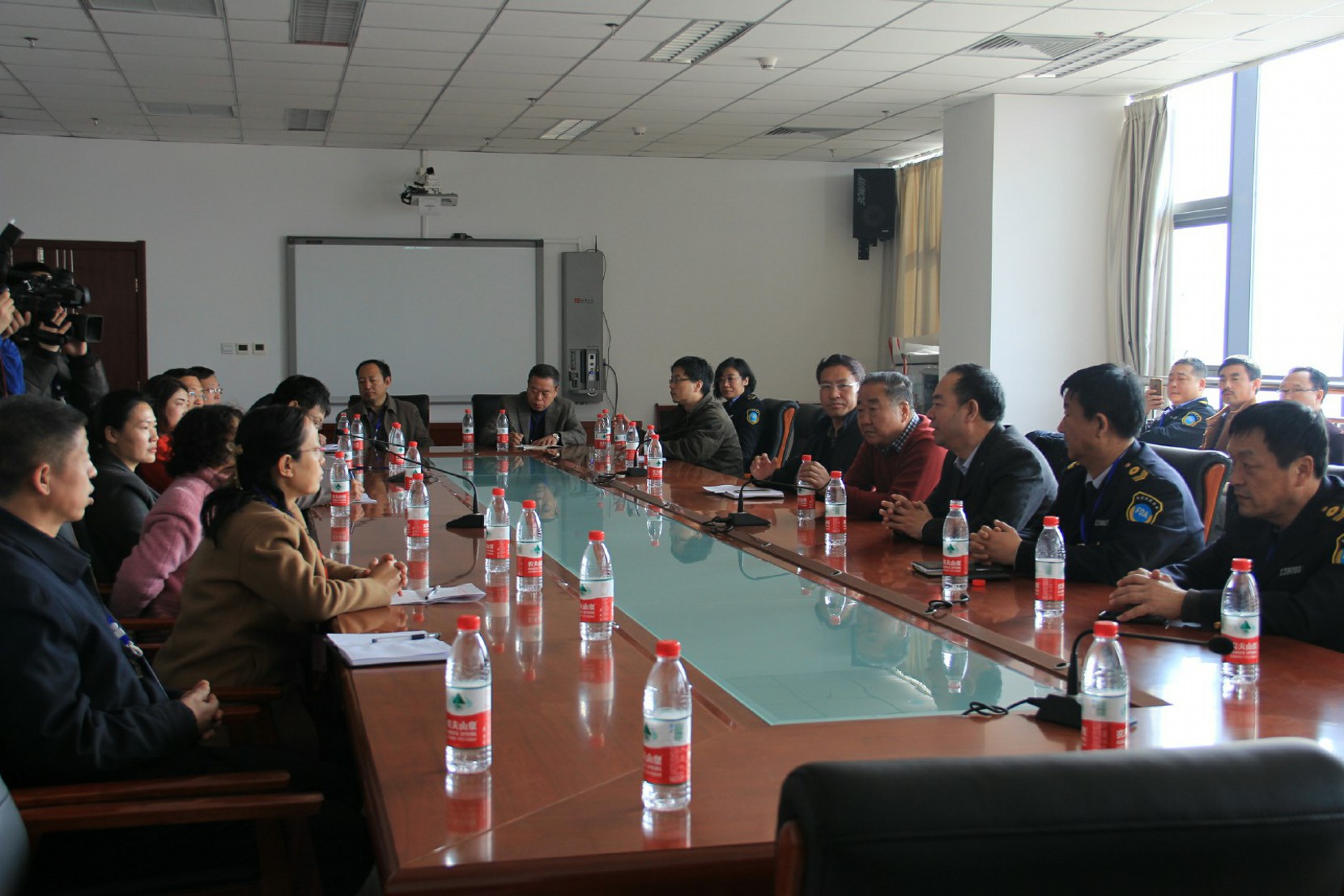 随后,参观团队一行来到会议室举行座谈会,我校校长兼党委书记刘月廷同志、副校长顾新立同志热情接待了大家。