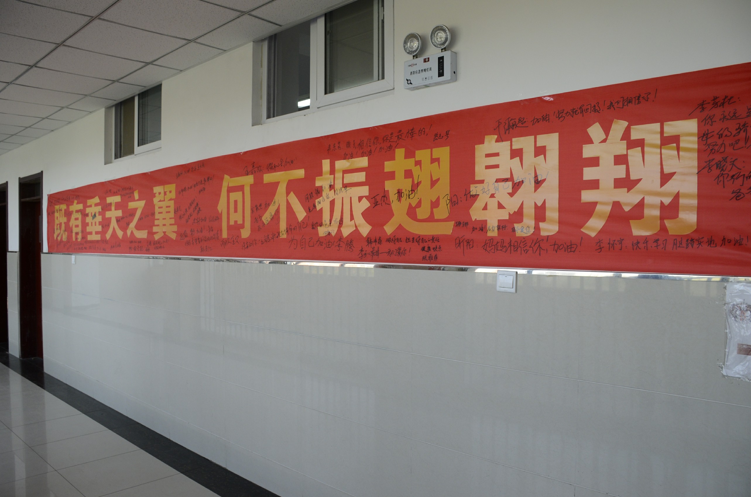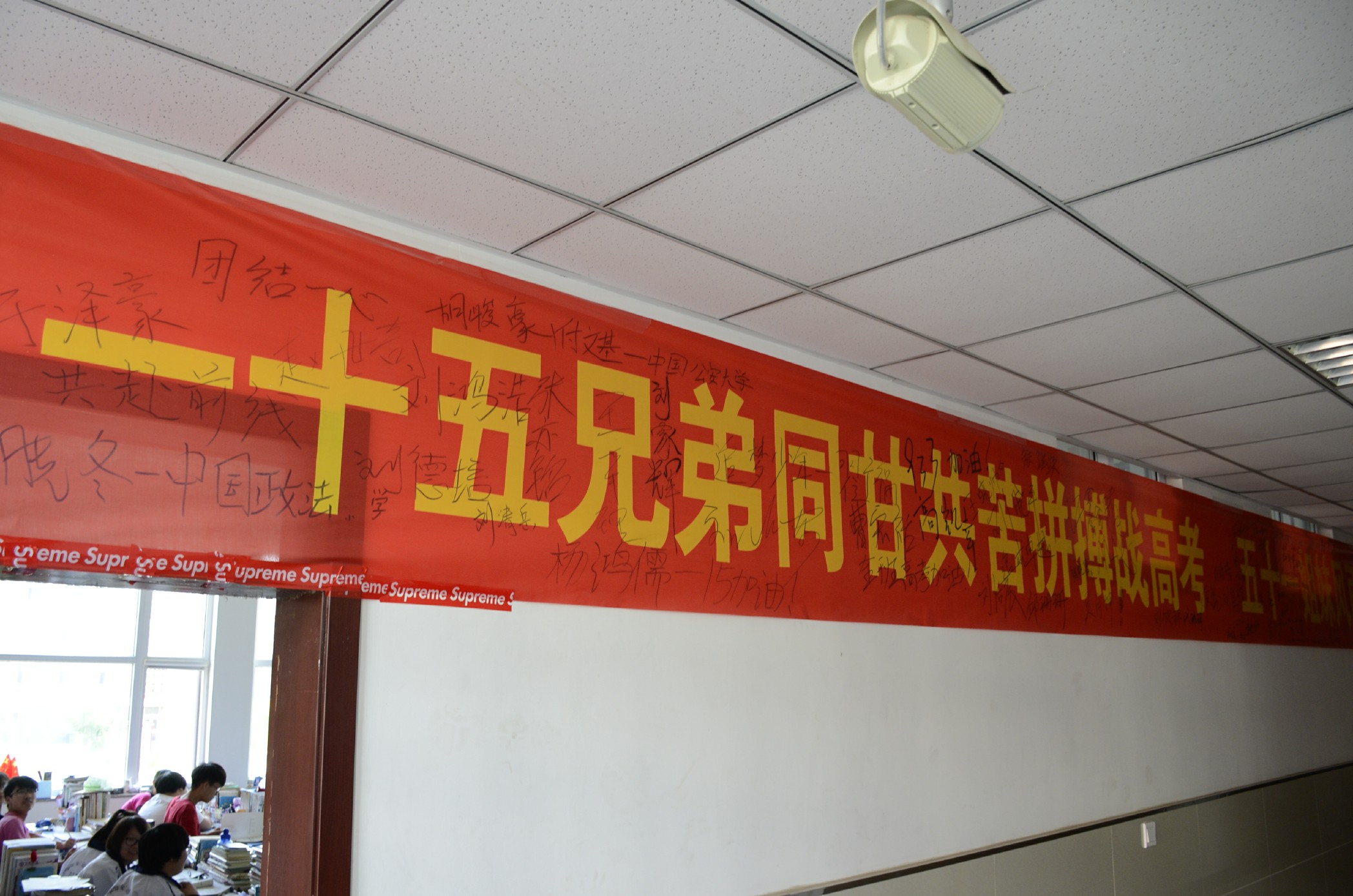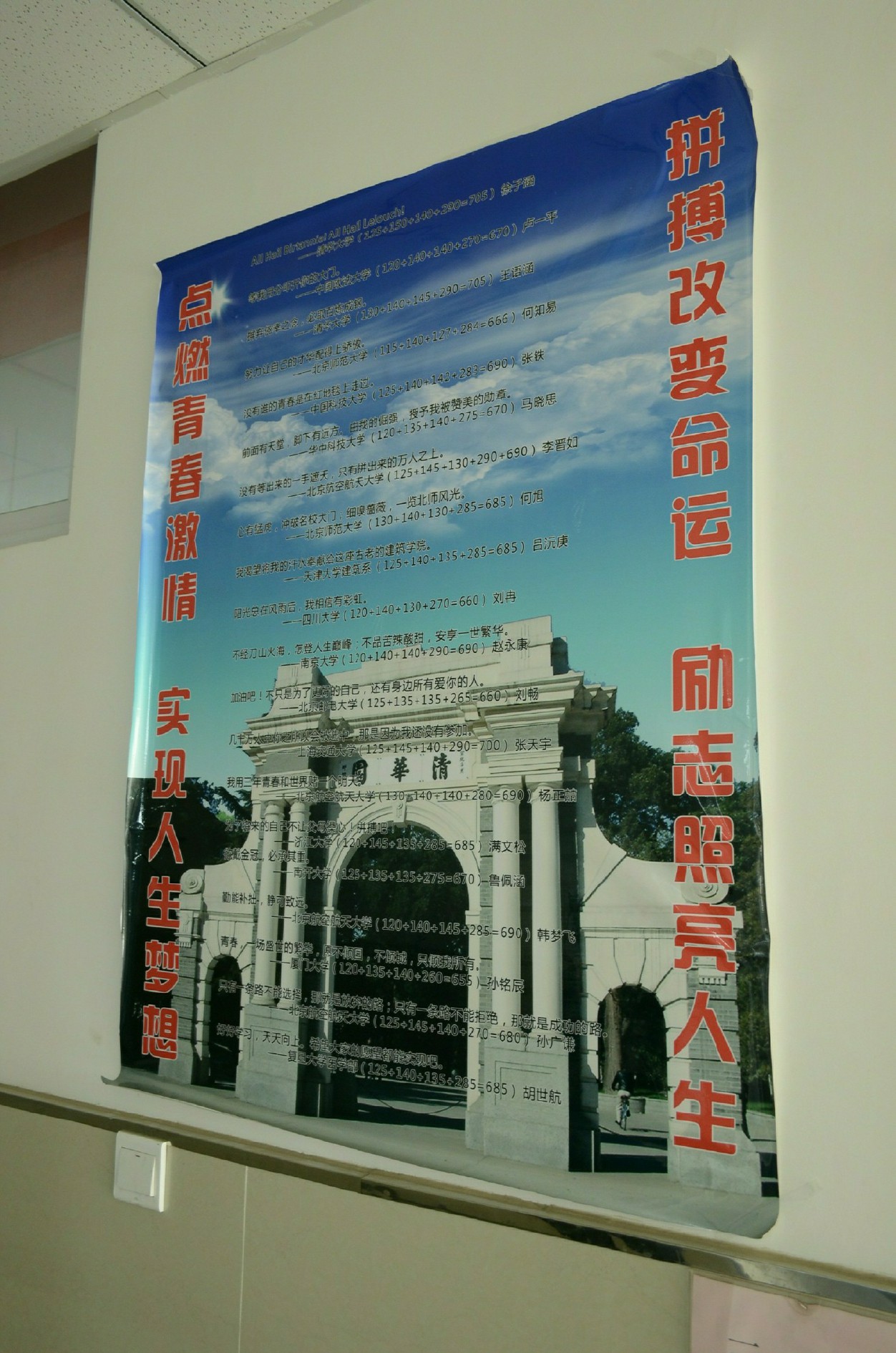 为了激发同学们的拼搏精神,鼓励同学们努力进取,给高考加油助威,许多班级定制了条幅挂在班中,有的班级还将至理名言、同学们的目标张贴出来,勉励同学们向心中的大学发起冲击。