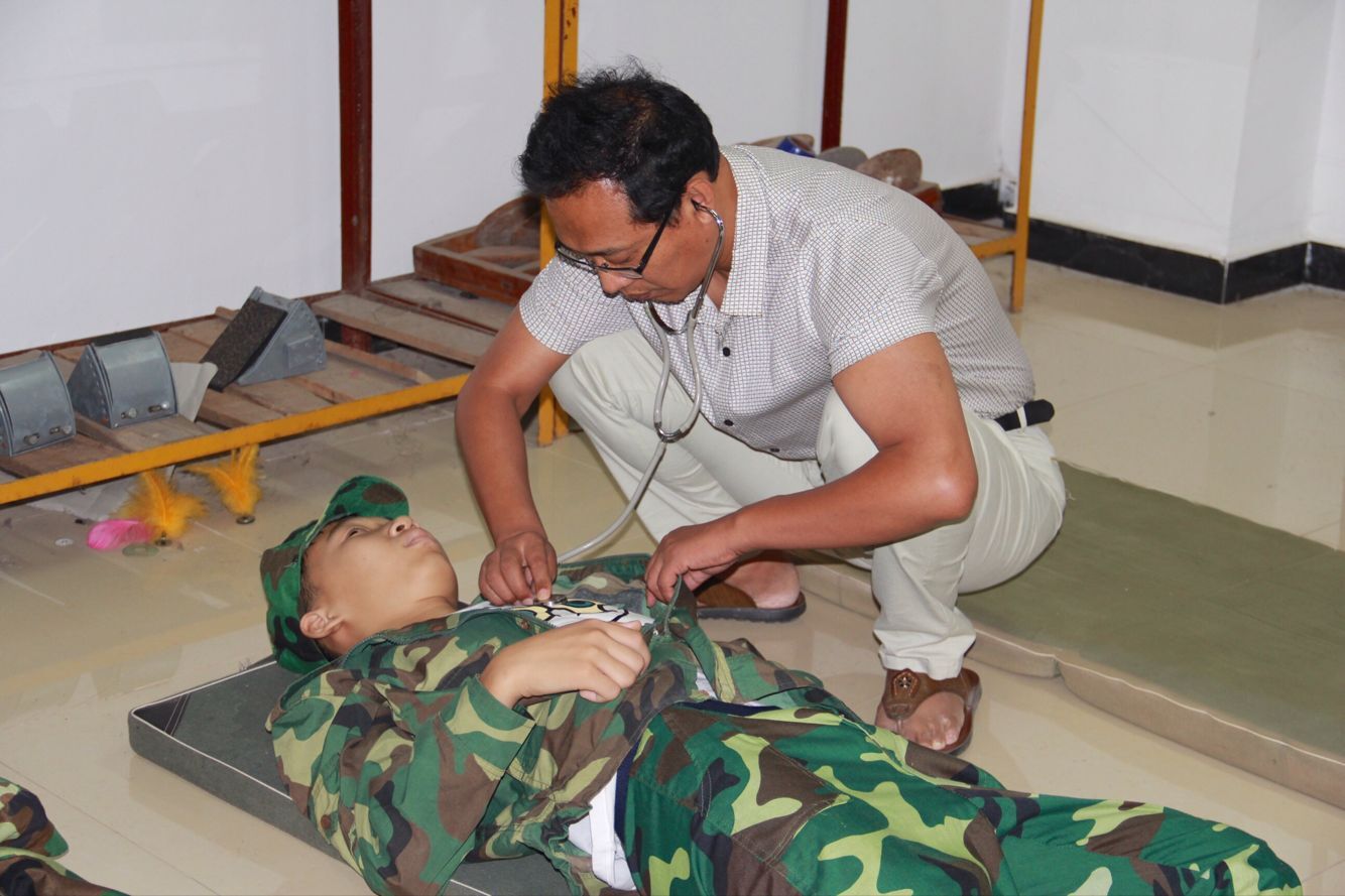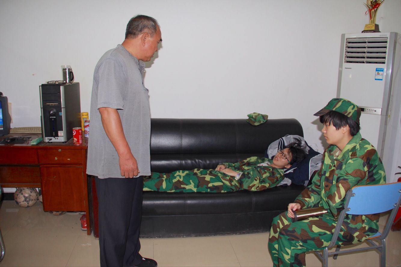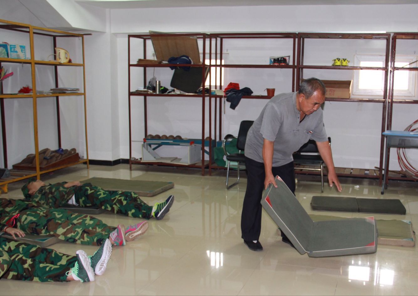 操场管理员叔叔,把自己的办公室改成临时医务室,用体育器材铺设成简单的床供身体不适的同学们休息,并且一再叮嘱大家务必吃早饭,明天还因为不吃早饭才来医务室的话他就要打你们屁股了!