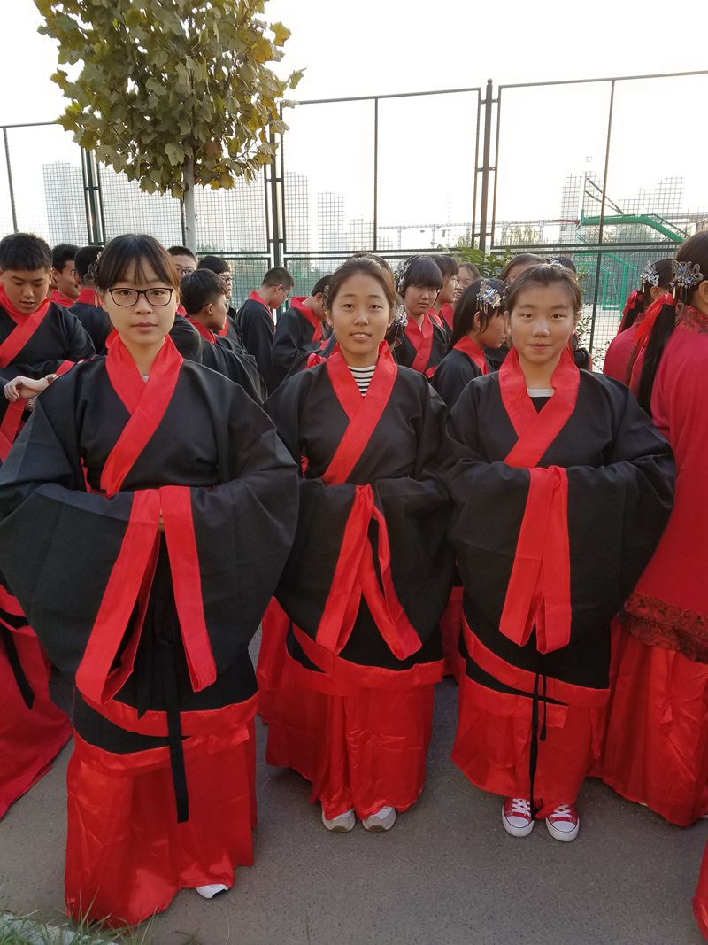 开幕式前夕,高二四班的同学们就开始了紧锣密鼓的筹备工作。这次活动由张亚亭同学提议。在班主任回丽媛老师的帮助下,通过近一个多星期的筛选,试装,最终选定了样式为男裳女裙的汉服。汉服至今已有八千多年的历史了,是汉族人的传统服饰。同学们穿上都兴奋不已。大多数同学都是第一次穿,但这次必然会让他们终身难忘。同学们还请来了三中的赵老师教他们汉族人的传统礼仪——男垂女端,还有行礼的礼节。开幕式当天,同学们的内心更加汹涌澎湃,当他们穿着漂亮的汉服在主席台下行礼的那一刻,全场为他们报以热烈的欢呼。
