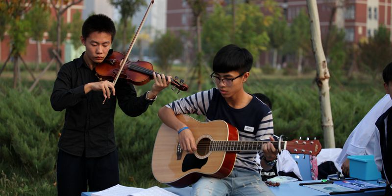 由校文学社主办,全校师生参与的跳蚤市场,同学们积极响应。为吸引更多顾客,高二25班可是花样百出,不仅有组织了乐器演奏,还有小合唱。小提琴手曹海泽独奏经典曲目《梁祝》《春节序曲》,吉他手宋俊盈弹唱民谣《安和桥》《玫瑰》,更有二人合奏及演唱校园歌曲。众多同学闻声而来,环绕着这两位同学,纷纷投去欣赏与赞美的目光,还有许多同学投币支持,并与二人合唱、拍照,不少教职工也驻足观看。一首《海阔天空》引起了全场共鸣,台上台下一起歌唱,沉醉其中。曲毕,掌声雷动,将本次演出推向了高潮。