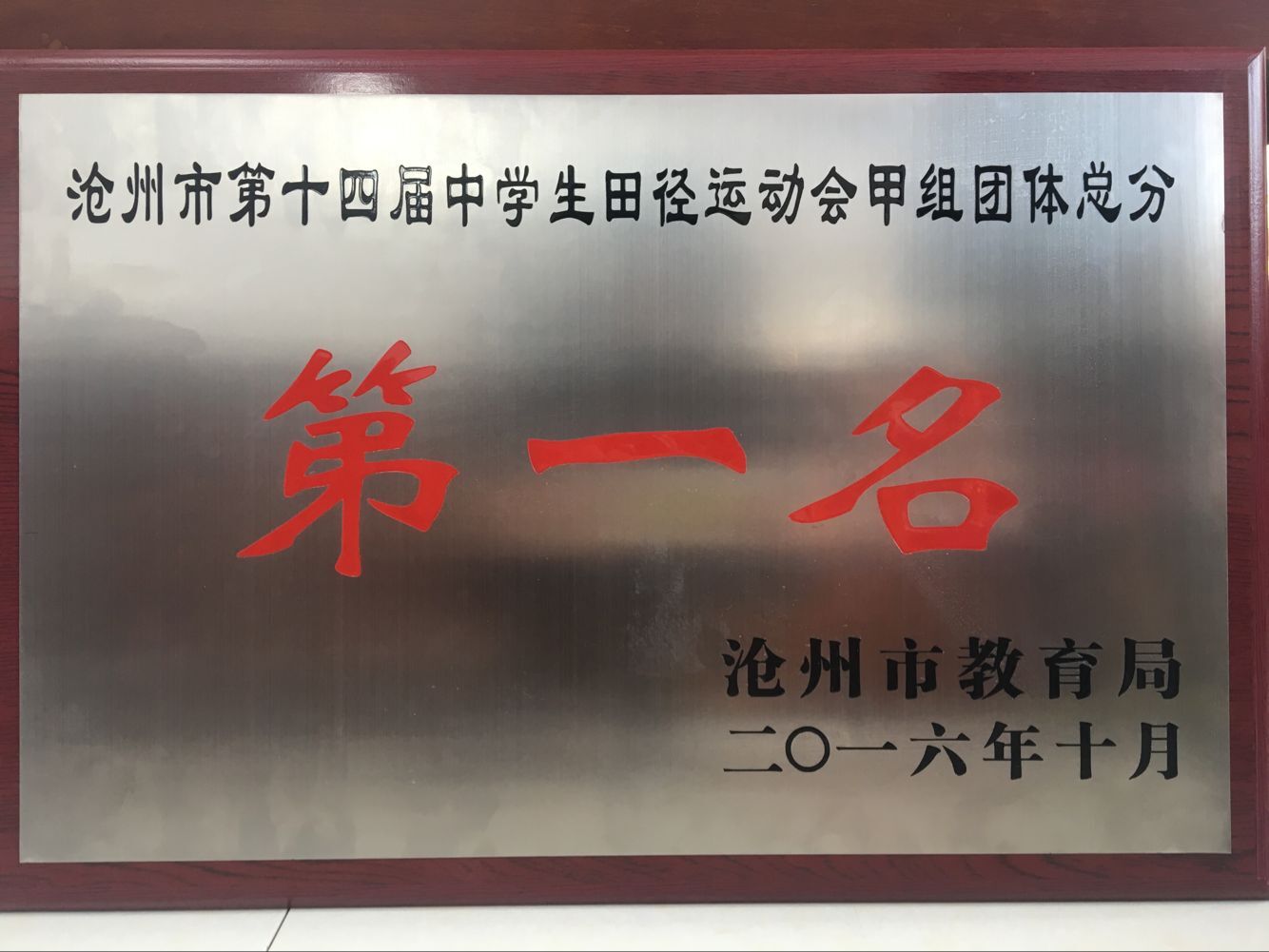 2016年10月16—19日,沧州市第十四届中学生田径运动会在盐山中学隆重举行。本届运动会历时4天,来自全市36个代表队的650余名运动员参加了本次比赛。我校派出24名运动员参加了本次比赛。经过努力拼搏,我校以253分总成绩荣获沧州市中学生田径运动会甲组(重点中学组)第一名。