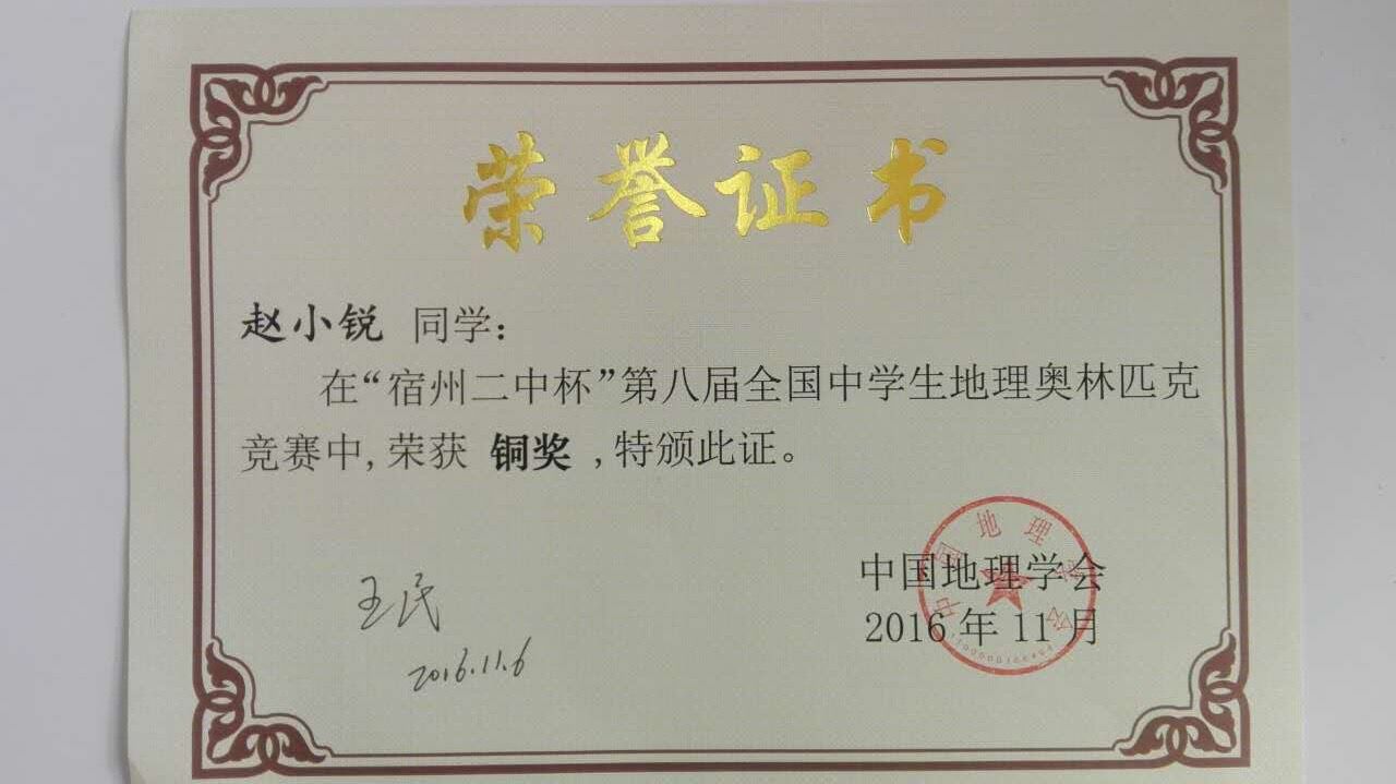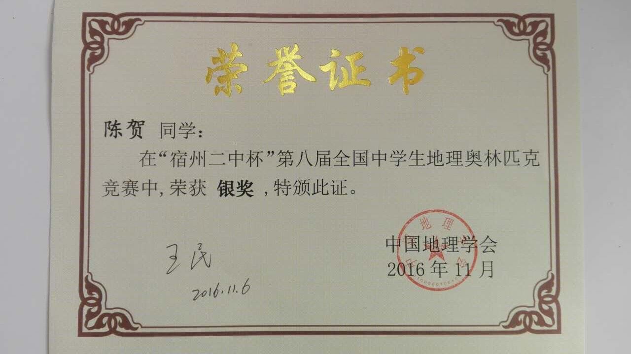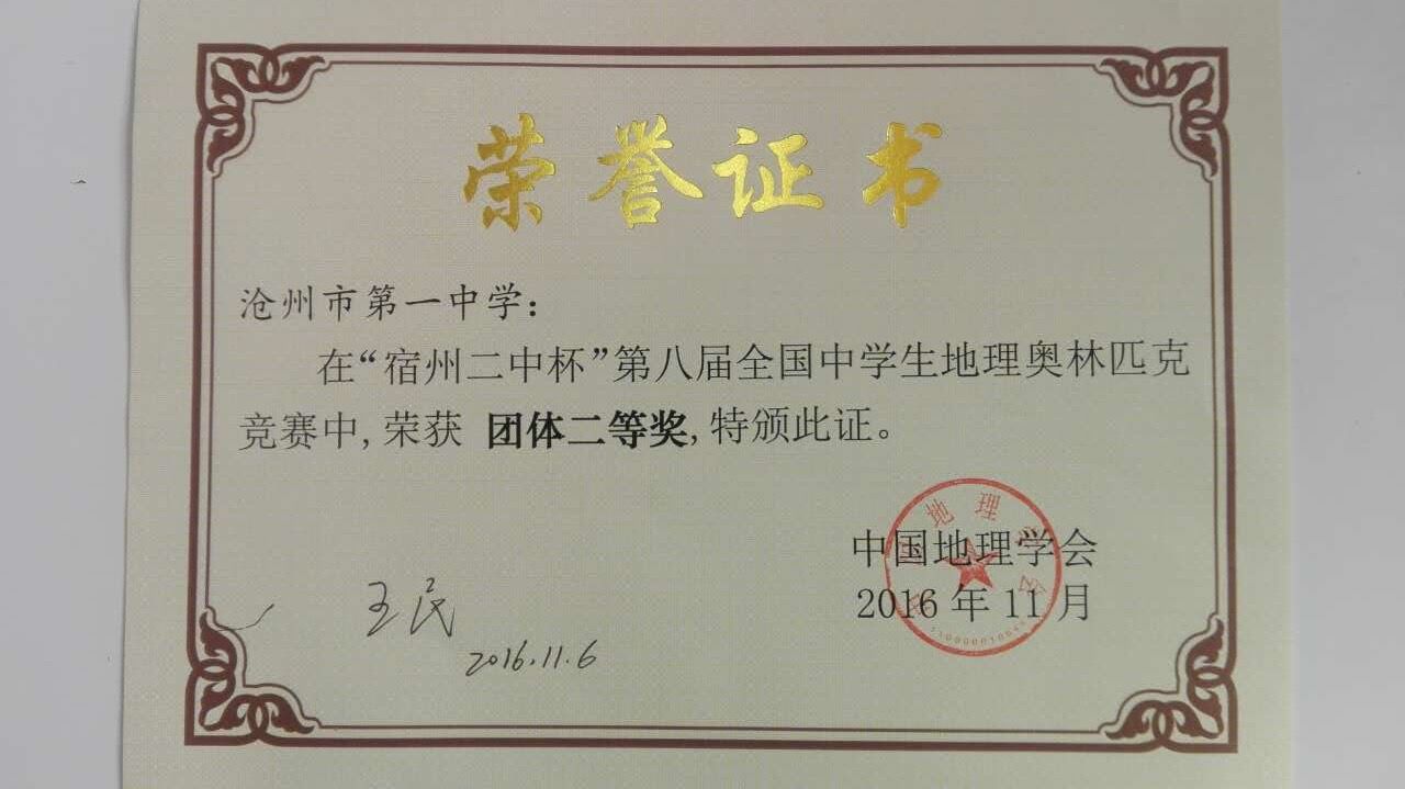 此次大赛由87支代表队近400名选手参赛。我校系首次参加全国级地理奥赛,凭借赛前精心准备,经过综合题、景观题和户外题三场比赛,陈贺同学获得银奖、赵小锐和白若雪获得铜奖,同时沧州第一中学获得团体二等奖的优异成绩。