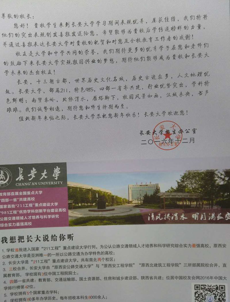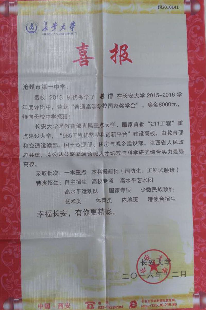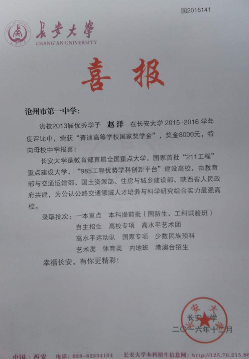 日前,长安大学给我校校长刘月廷发来喜报,祝贺我校2013届优秀学子赵洋在长安大学本科学习期间,成绩优异,表现突出,被推荐为免试2017级硕士研究生。