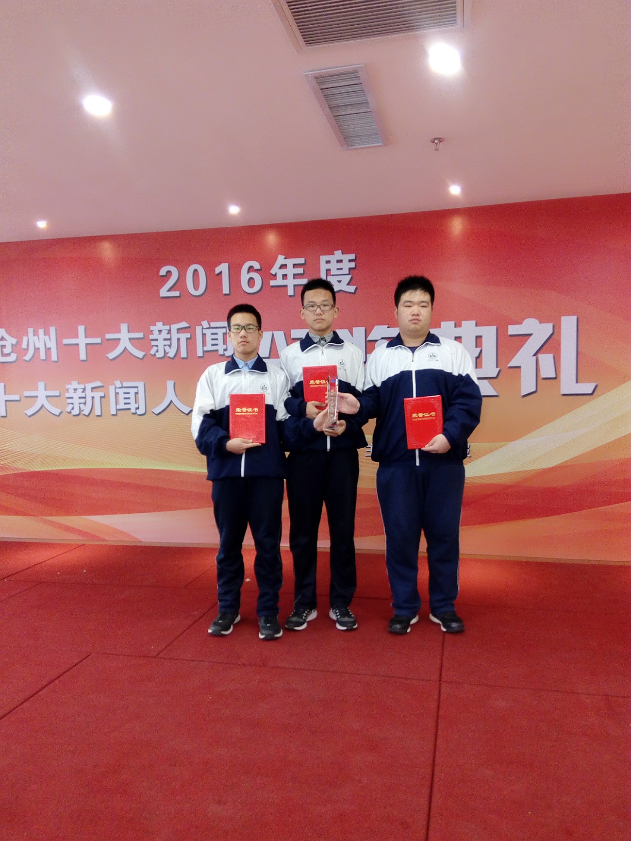 2017年1月11日上午,2016年度“沧州十大新闻”和“沧州十大新闻人物”颁奖典礼在传媒大厦举行,我校机器人代表队的暴子腾、史梦林、崔翔赫三位同学被评为“沧州十大新闻人物”。
