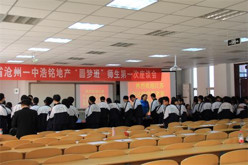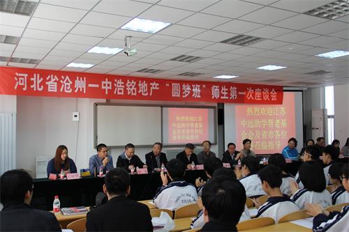 2017年4月20日上午,河北省沧州一中浩铭地产“圆梦班”师生第一次座谈会在高一阶梯教室举行。这场历时三个多小时的座谈会,是继去年浩铭地产助学圆梦项目启动后的第一次跟进活动,江苏中远助学帮老基金会领导徐中远,省教育厅领导张子湘,市教育局领导崔增录,一中领导刘月廷,北京各高校志愿者以及圆梦班师生等参加了座谈会。此次座谈会以“排疑解难,助力加油”为目的,高屋建瓴,具有极大的指导意义。