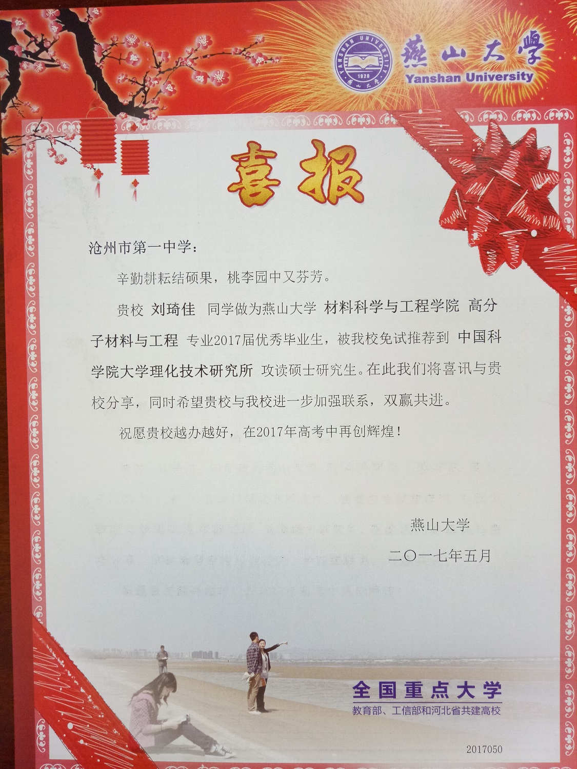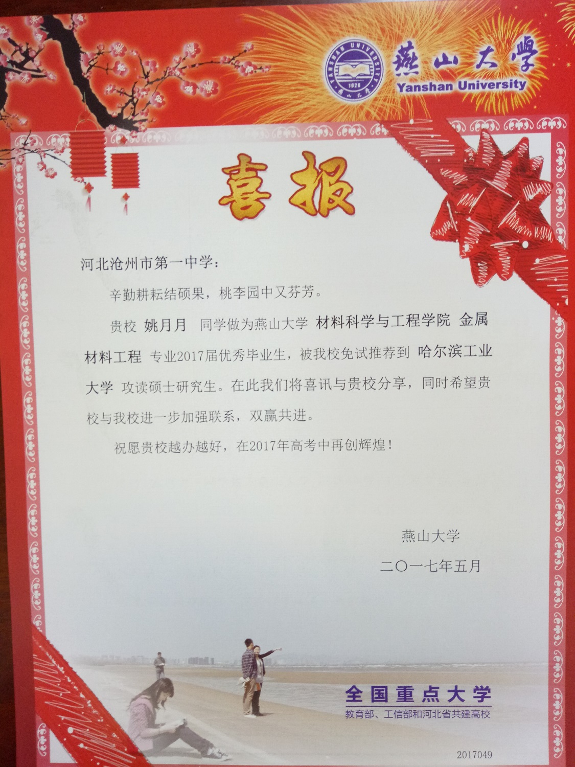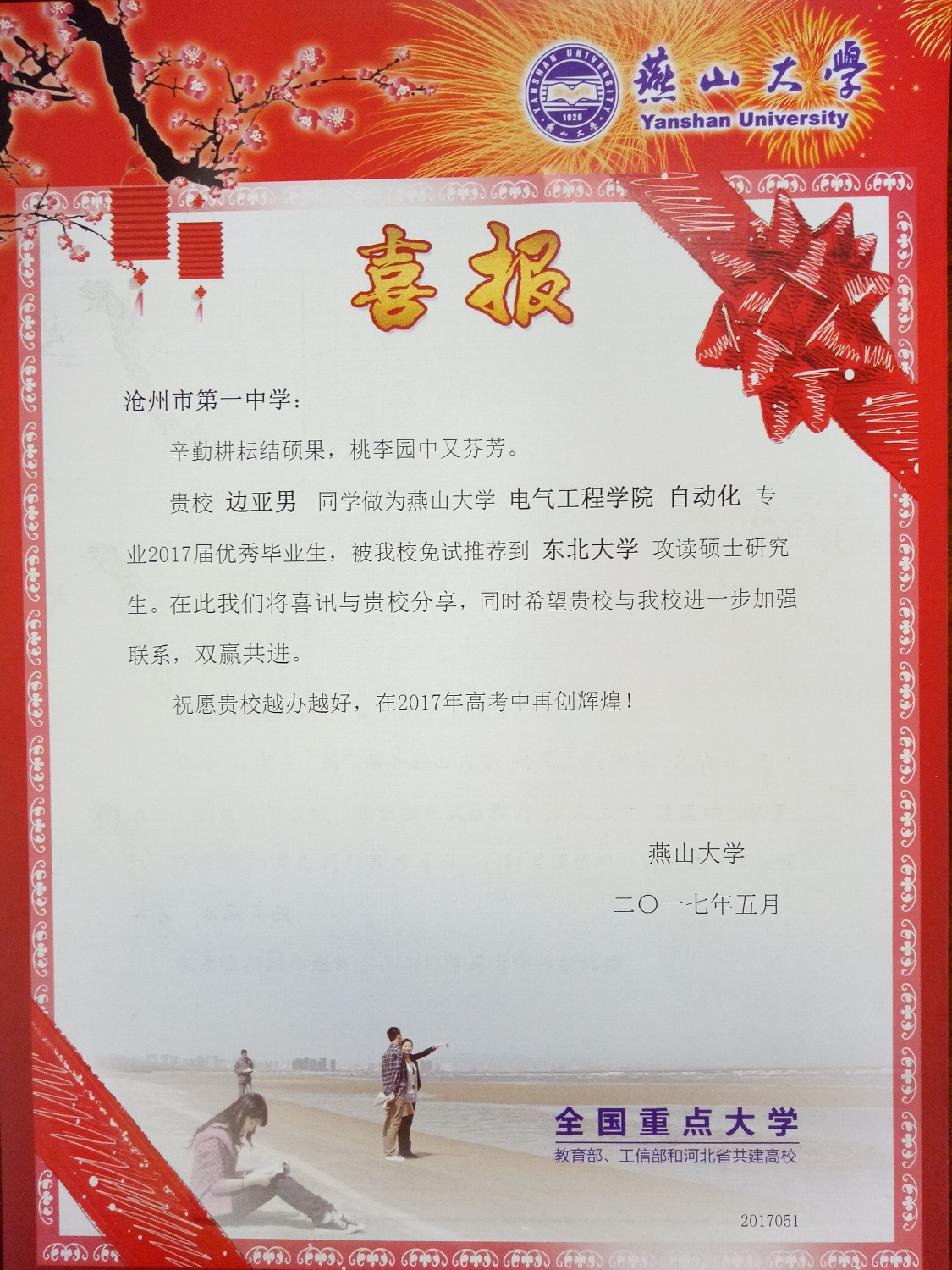 日前,燕山大学给我校发来喜报,祝贺我校优秀学子郭旭、边亚男、刘琦佳、张均源、姚月月、陈景浩被燕山大学免试推荐到多所高校攻读硕士研究生。