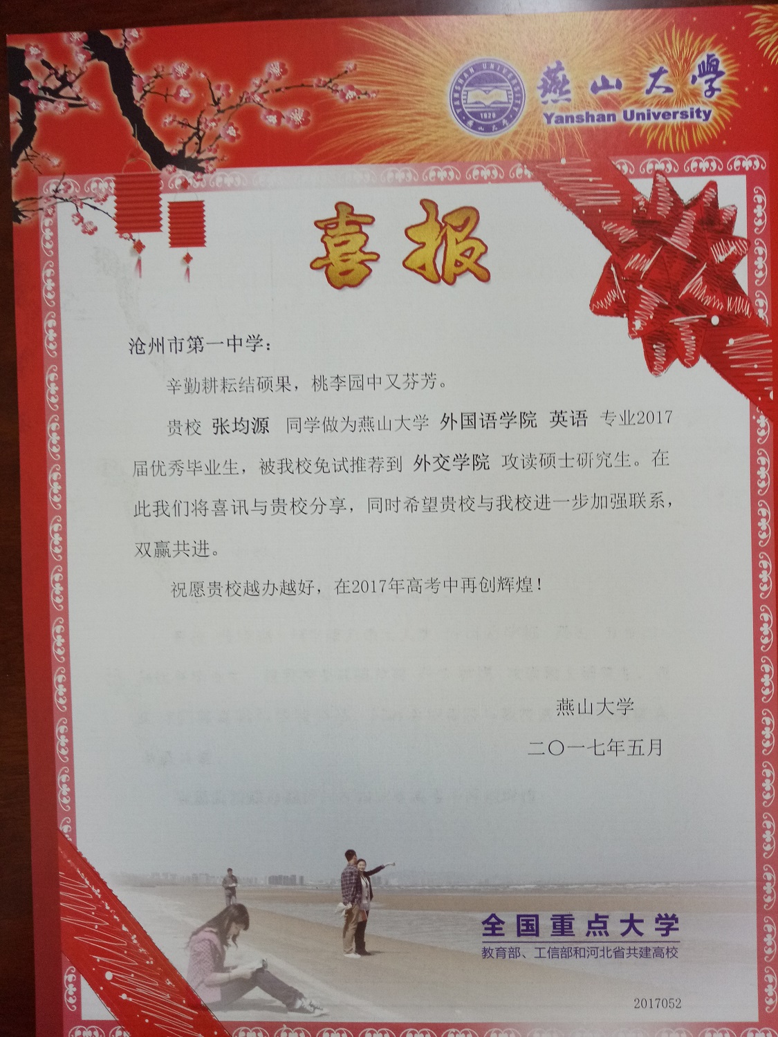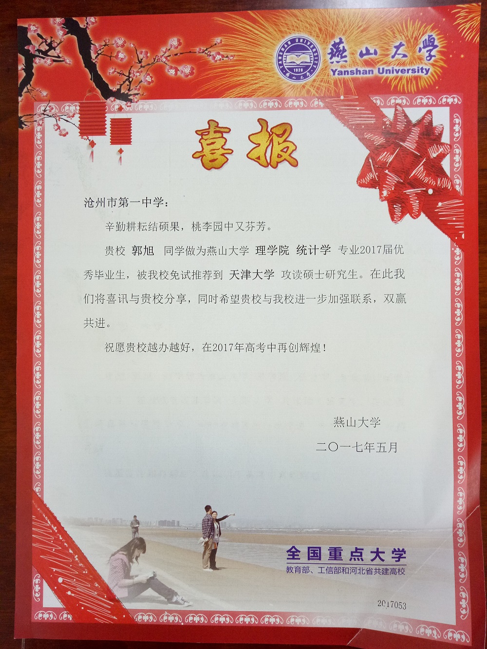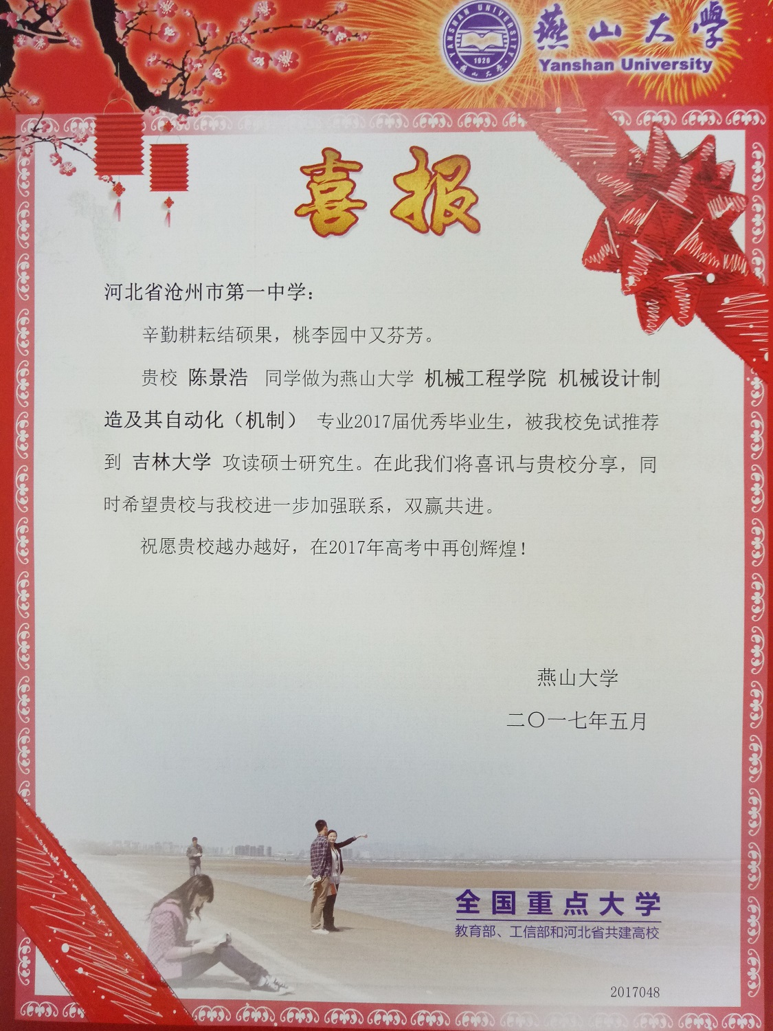 日前,燕山大学给我校发来喜报,祝贺我校优秀学子郭旭、边亚男、刘琦佳、张均源、姚月月、陈景浩被燕山大学免试推荐到多所高校攻读硕士研究生。
