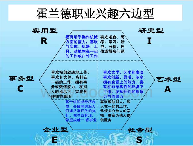 霍兰德六边形(见上图)对于我们选择适合自己的专业、职业是非常有帮助的。举例来说,如果你选择了1号R岛(自然原始岛),说明你是一个实用型(R)的人,你适合选择的是R型的专业和工作。不过,你也可以选择从事相邻的事务型(C)或研究型(I)的专业和工作,但最好避免从事相对的社会型(S)的专业和工作,因为这和你的兴趣刚好是互相排斥的。