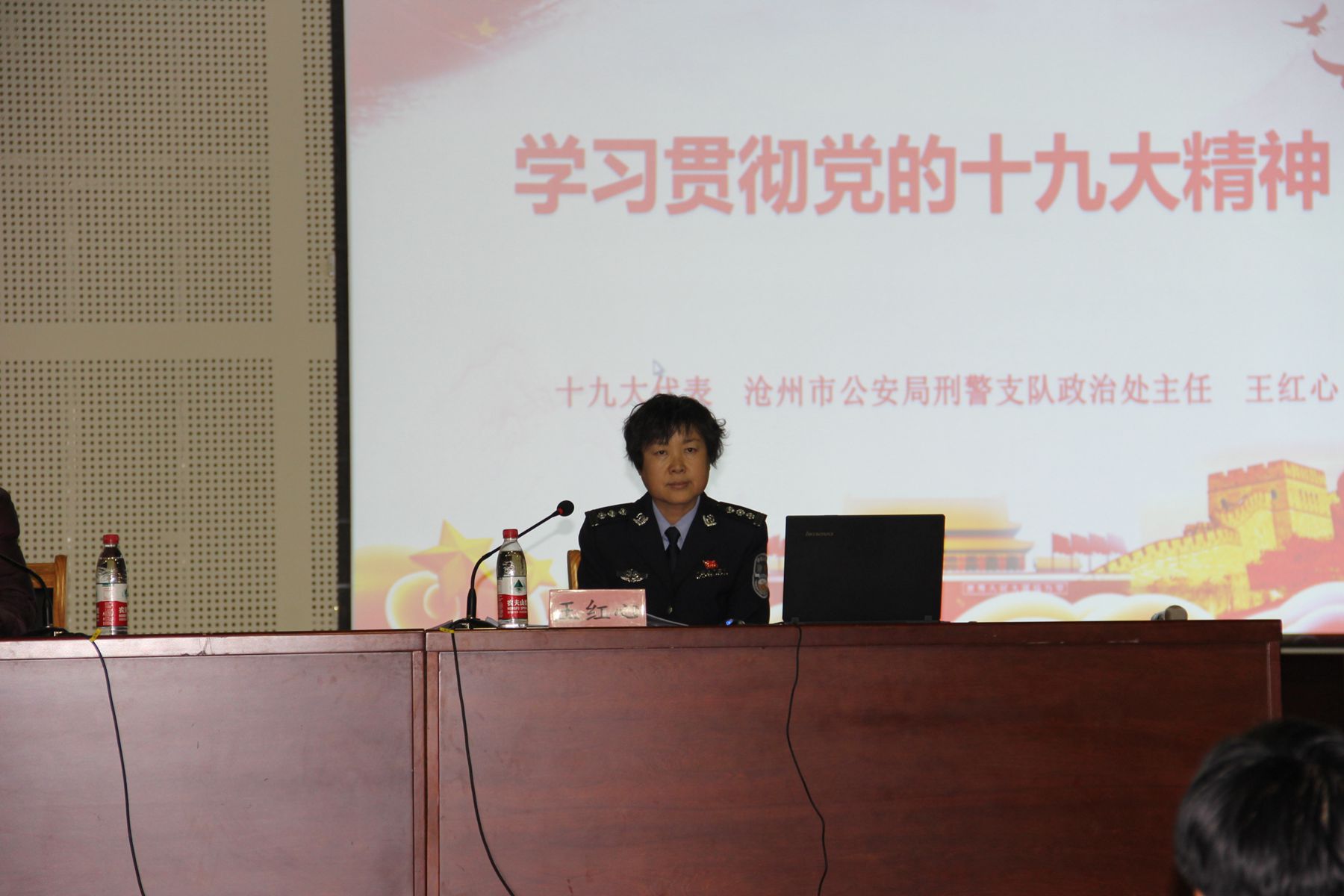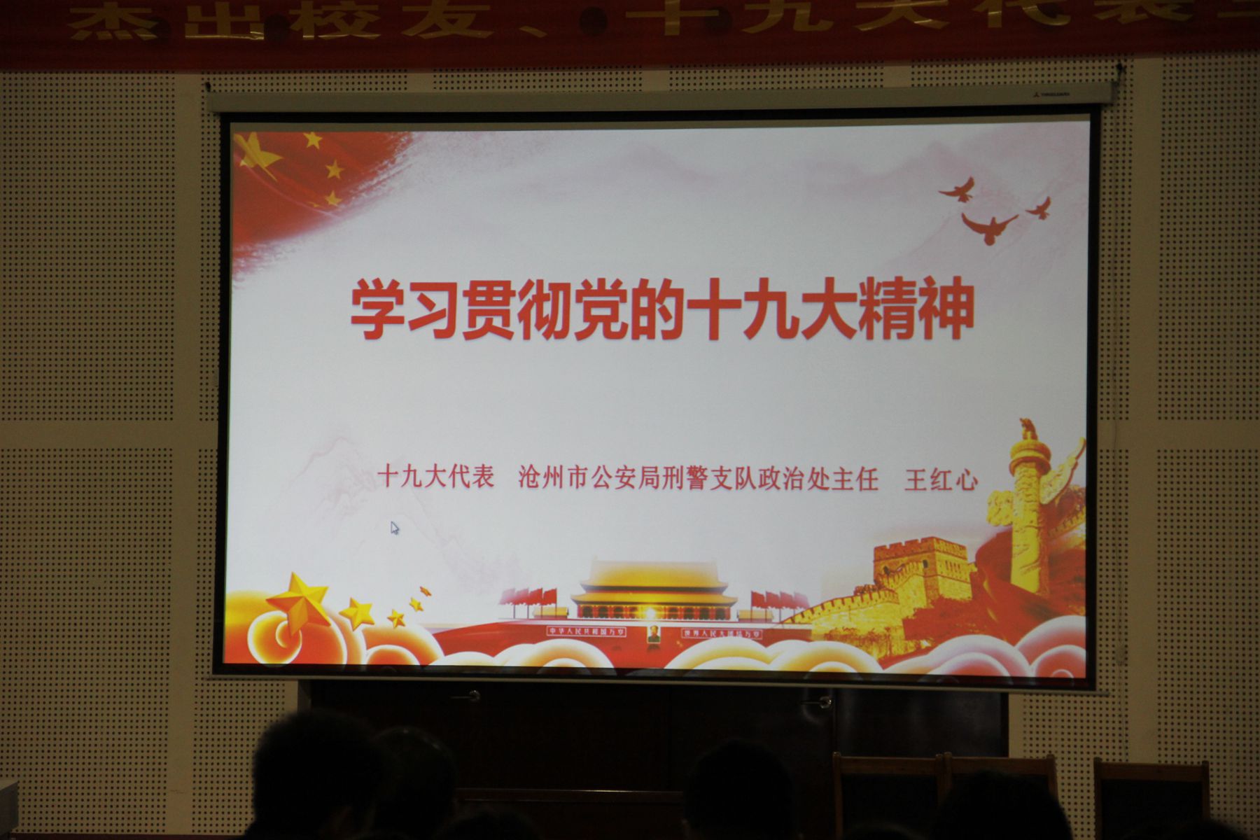 11月22日下午,我校在体育馆组织召开了“沧州一中学习贯彻党的十九大精神宣讲报告会”。邀请党的十九大代表、沧州市公安局刑警支队政治处主任、杰出校友王红心来母校宣讲十九大精神。我校400多名教职工出席了会议。会议由校长刘月廷主持。