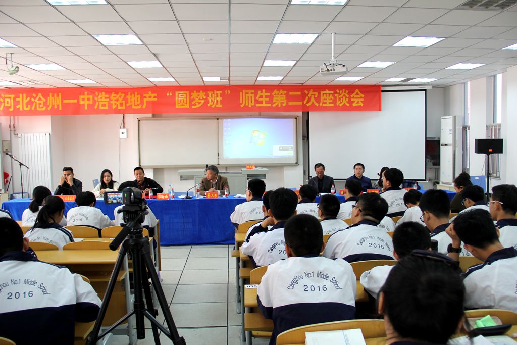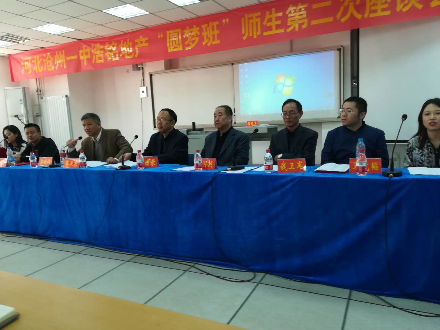 春风送暖,百花争艳,在这个温暖而美丽的季节,河北省沧州一中浩铭地产“圆梦班”师生第二次座谈会于4月11日在高二年级阶梯教室如期举行,这是浩铭地产继去年座谈会的又一次跟进活动。江苏中远助学帮老基金会理事长蔡卫东,副理事长郭剑伟,沧州市教育局副局长崔增录,沧州一中校长兼党委书记刘月廷,副校长钱卫军,清华大学、人民大学、北京航空航天大学等名校的志愿者,圆梦班全体师生,参加了此次座谈会。