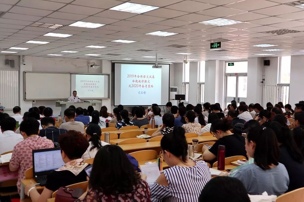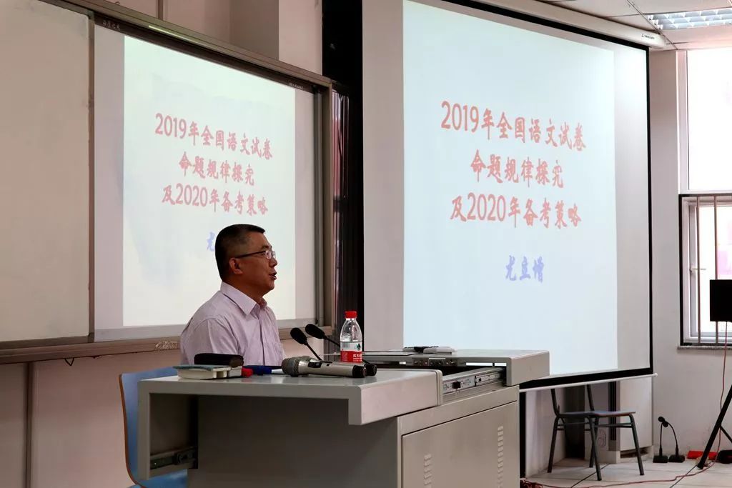 首先是大家期盼已久的尤立增老师的讲座——《2019年全国语文试卷命题规律探究及2020年备考策略》。尤老师作为国家级教学名师、教育部领航工程名师、国家级名师工作室主持人,他对高考的解读让与会老师醍醐灌顶。尤老师分析了2019年高考全国三套的命题导向、根本任务。指出试题注重考查核心素养和传统文化,考点覆盖面和试卷结构合理,能力层级比例配置恰当,能够实现选拔人才和服务教学两大任务。并按照高考试卷题型,依次就论述类文本、实用类文本、文学类文本、古诗文阅读、语用表达、作文逐一分析其设题特点和应试策略。尤其是作文,对作文试题的“命题语境”,角度立意的选择和为高中作文教学带来三方面的启示做了具体分析。真是柳暗花明,拨云见日。