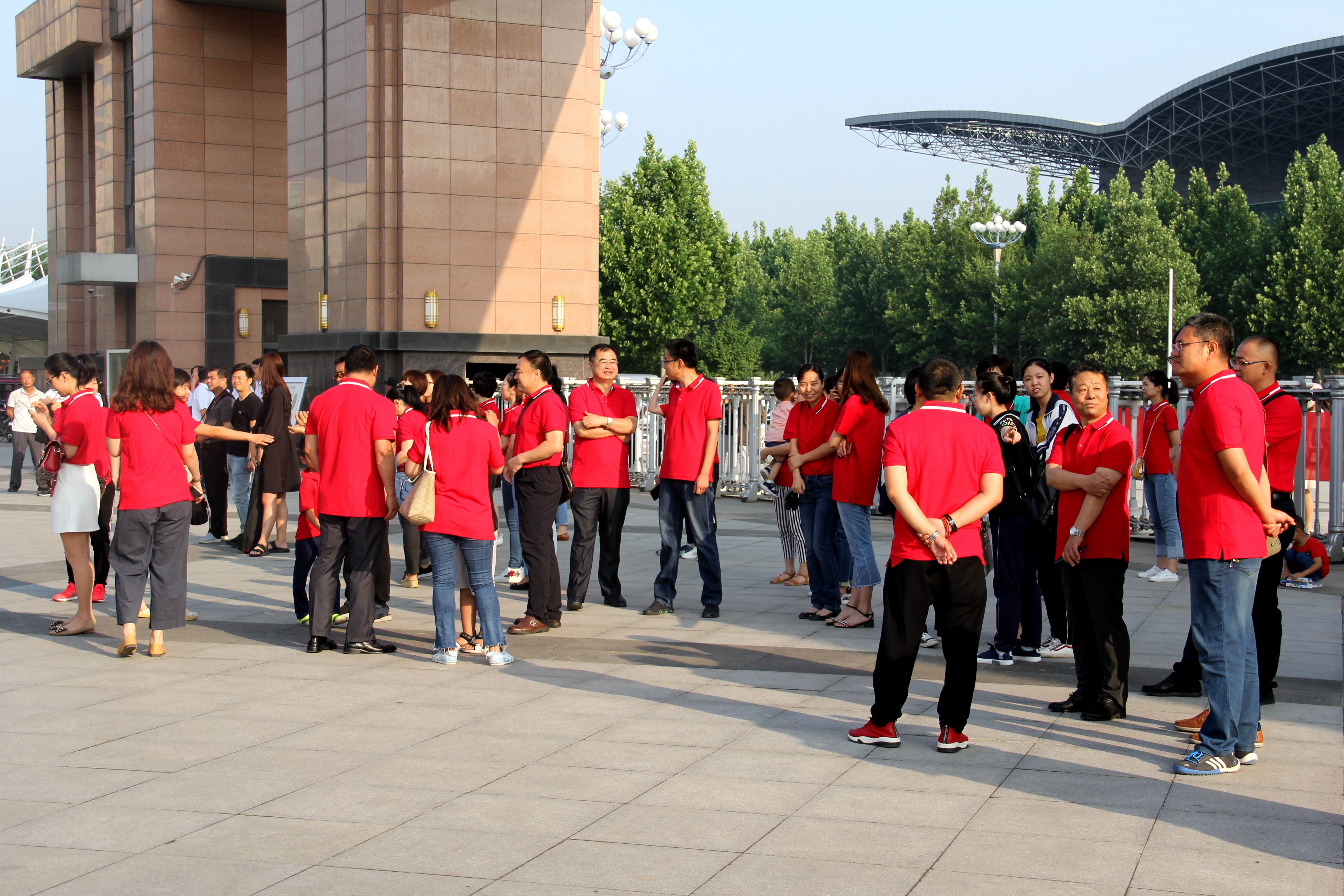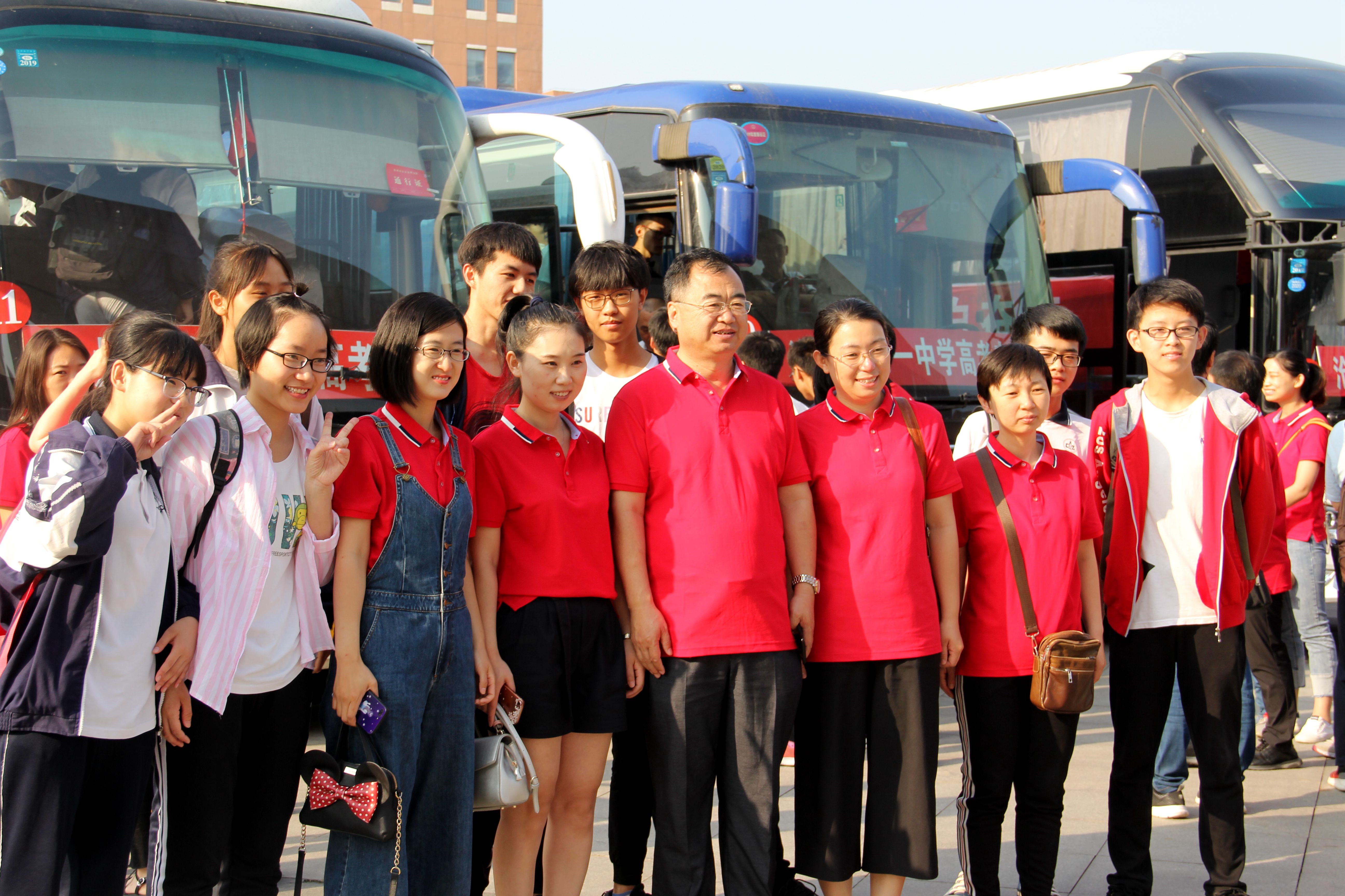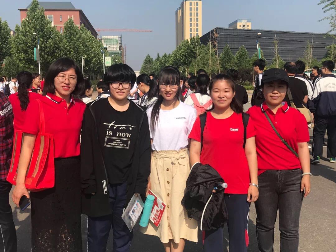 我校党委书记、校长于秀娥带领学校领导班子及高三年级全体教师,不到7点便已经等候在学校的广场上,准备为即将征战考场的高考学子们送行助威。他们身着红色T恤衫,一片喜气洋洋。