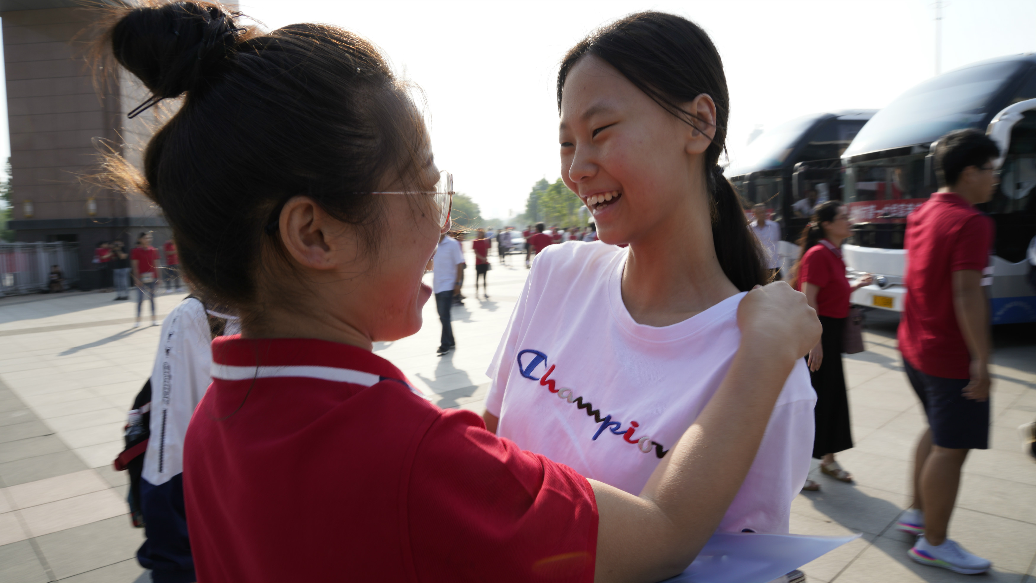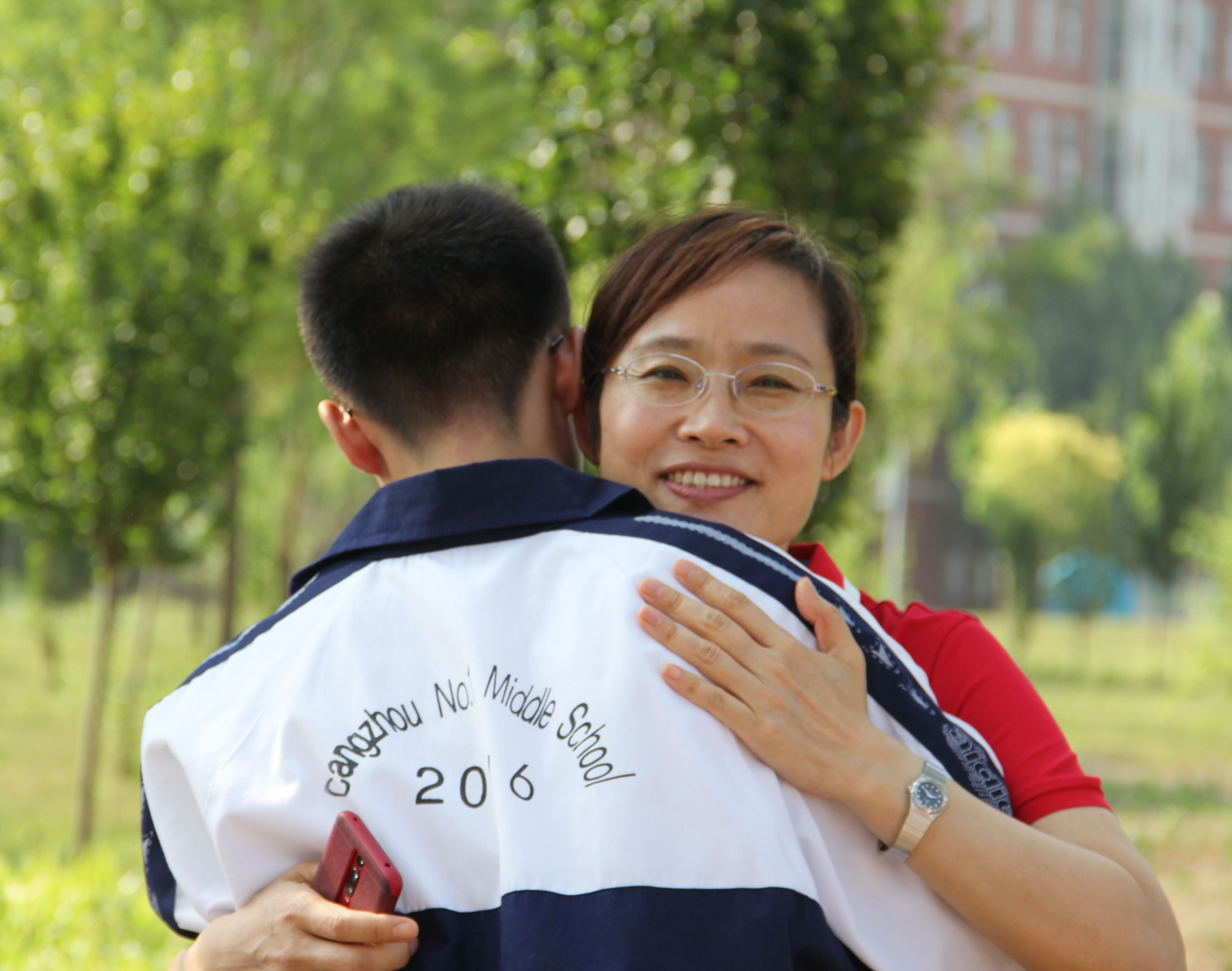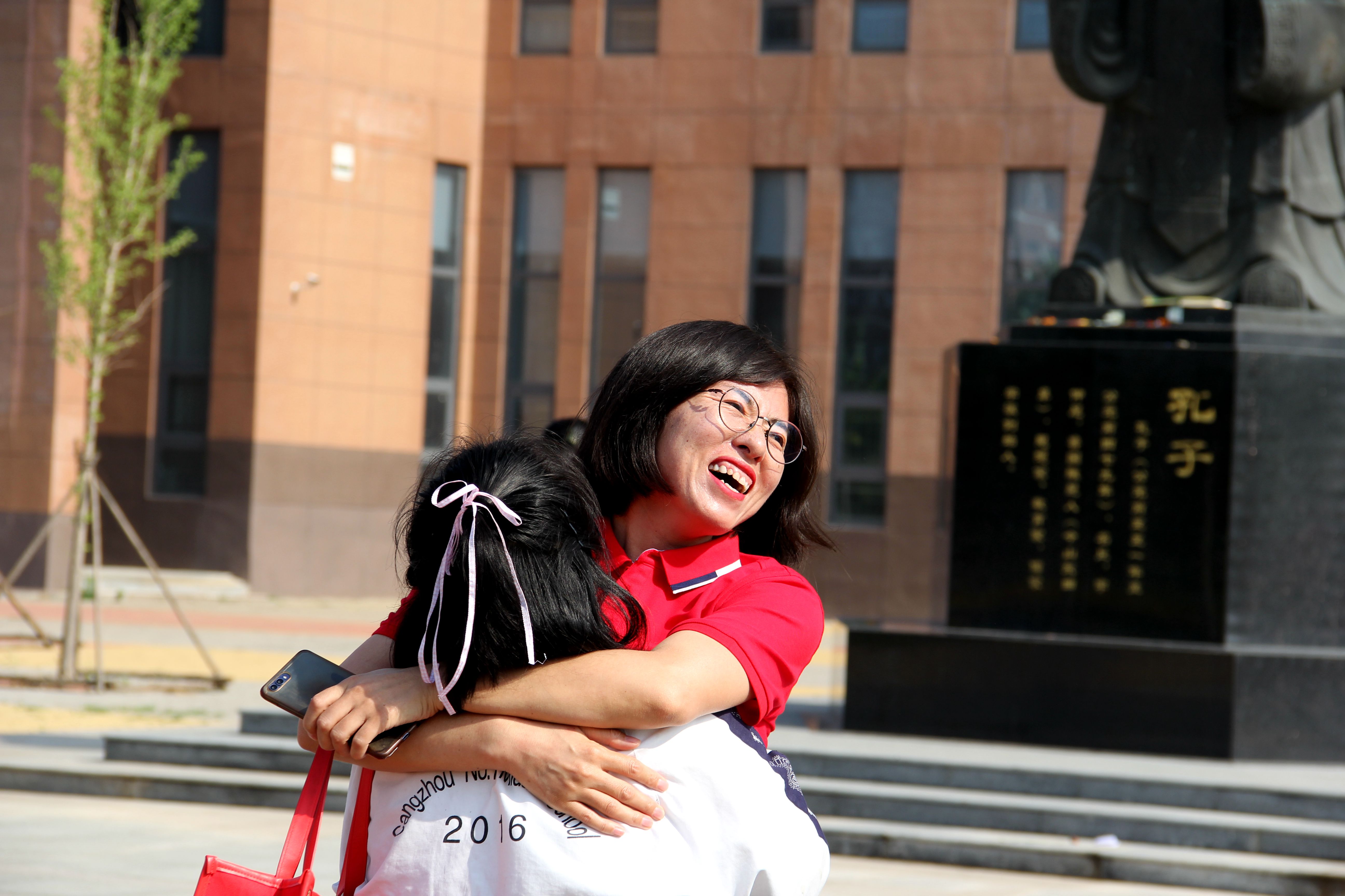 学生们激动地聚拢来,和自己的老师、校长拥抱合影。