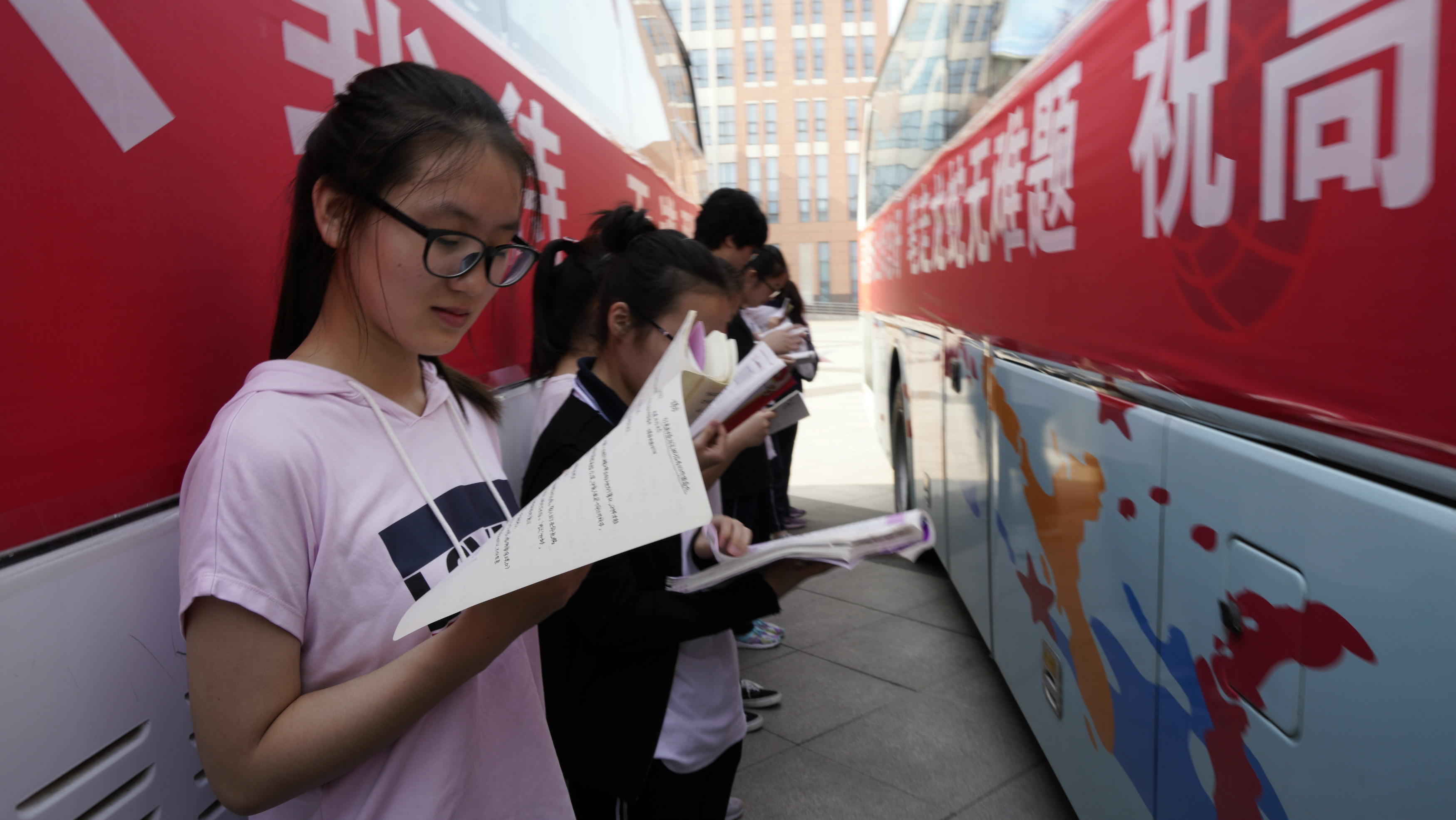 老师们首先集合在学校北门广场上为到外校高考的考生送行。