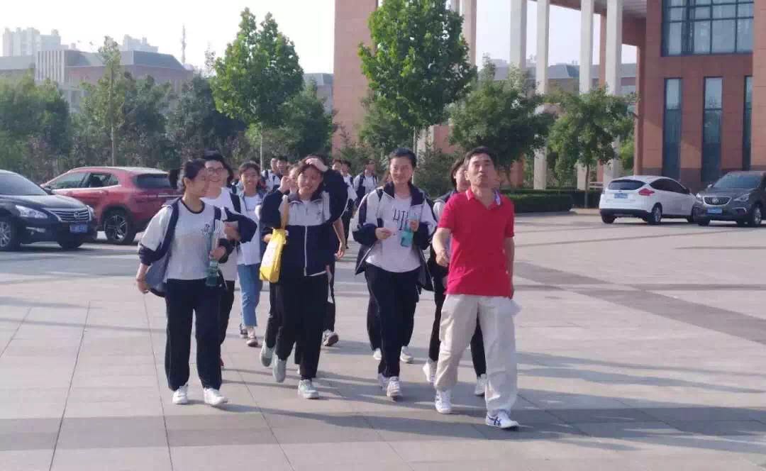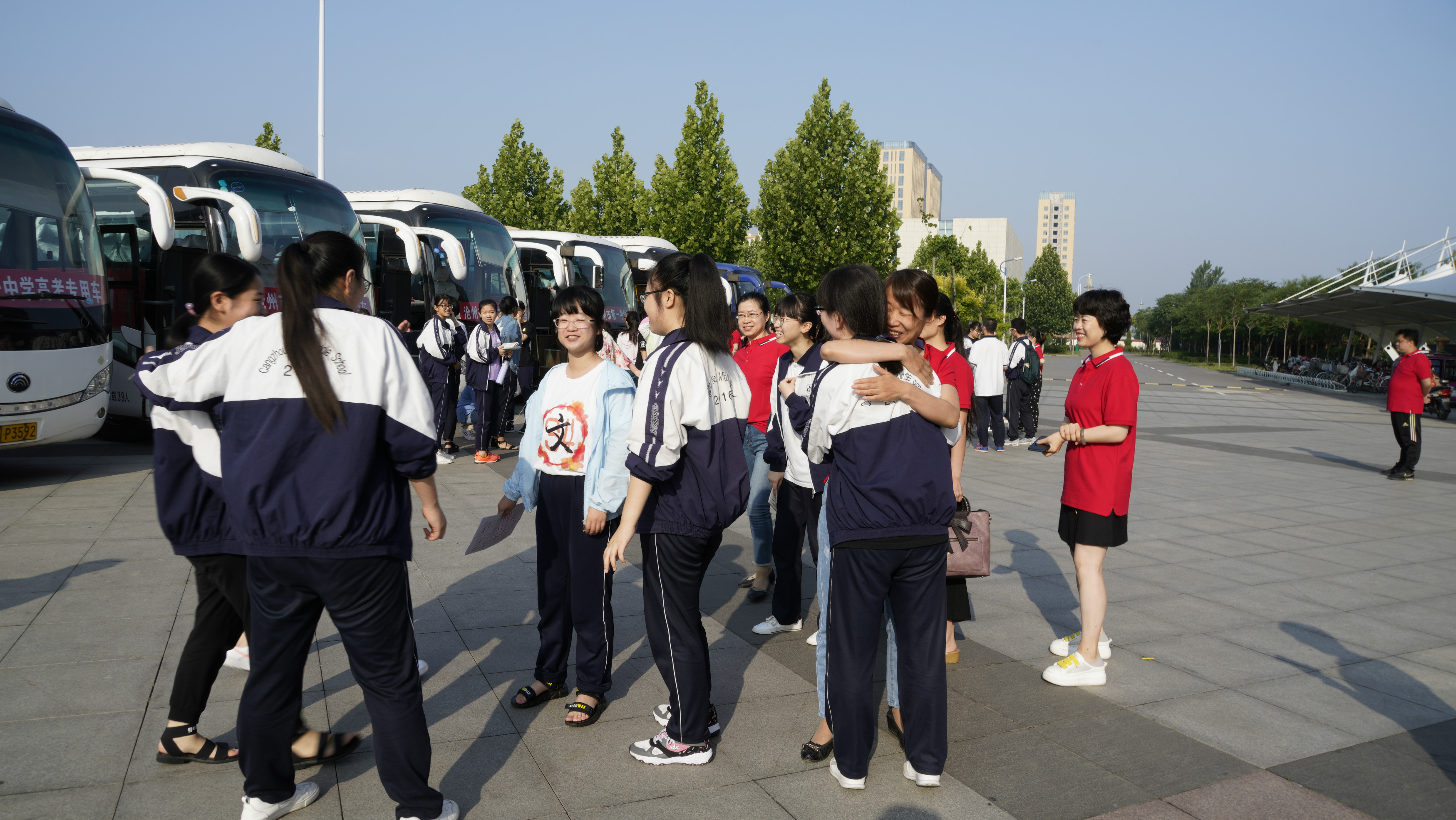8点钟,校领导和老师们又齐聚在我校图书馆前广场欢送在一中参加考试的学生们。