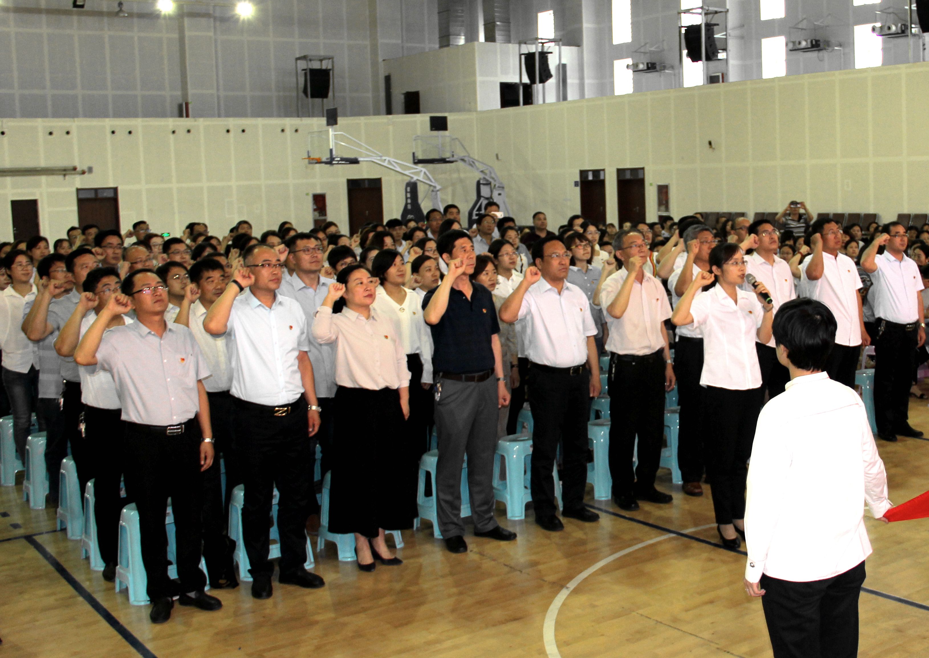 会上,首先开展了重温入党誓词活动。我校162名党员在党委书记、校长于秀娥的带领下面向党旗庄严宣誓。入党宣誓时的庄严承诺、坚定决心再一次在党员们胸中激荡,唤醒了全体党员的先进意识,增强了党性意识,也使其他干部员工受到了心灵的震撼。