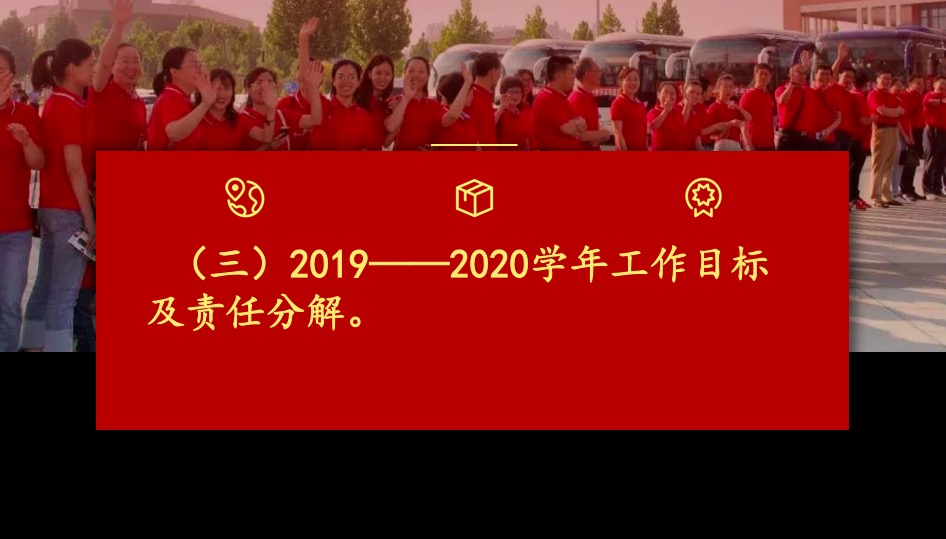 二是把准方向,明确目标,凝聚全校师生力量,阔步向前。结合学校多年的办学特点、生源情况及师资优势,学校确定了“立德树人,培尖促优,为学生的幸福人生奠基”的办学方向和“一年上台阶,两年求突破,三年大变样”的新目标。于校长对2019—2020学年工作目标、责任,做了详细分解。