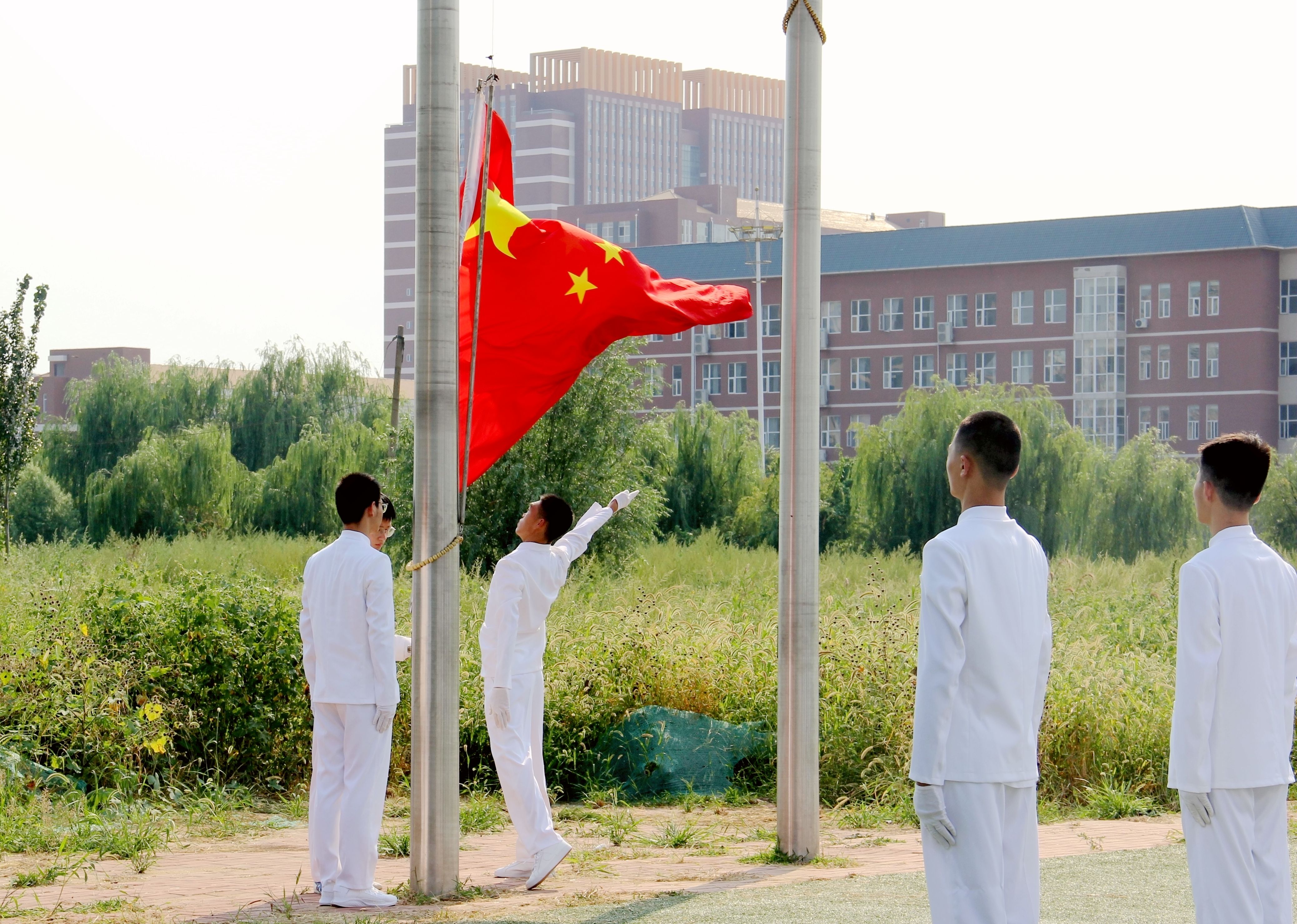 典礼在庄严的升旗仪式中拉开了帷幕,全体师生注视着五星红旗冉冉升起,肃立高唱国歌,致敬我们伟大的祖国。