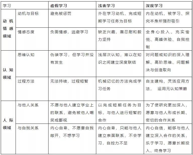 学生浅表学习(surface learning)的情况在课堂中也非常普遍。浅表学习是一种以完成外在任务、避免惩罚为取向的学习行为,以机械记忆和反复操练为主,缺少深度思维加工,因此学习成果多以复制为主,难以迁移和深化。